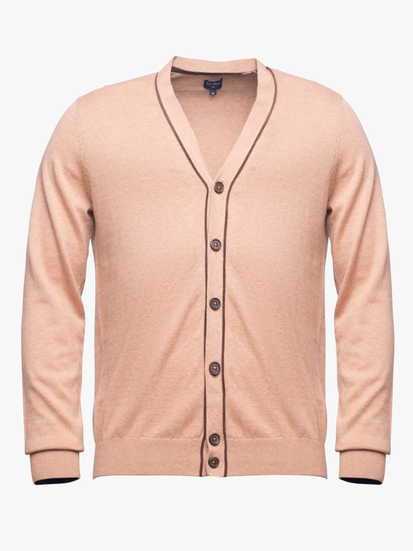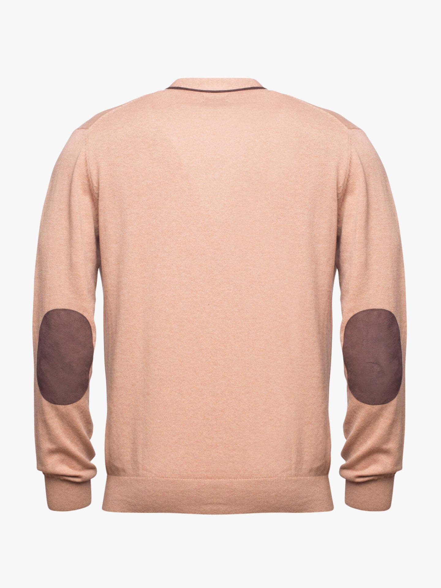 Cardigan para homem liso camel com fecho botões e pormenor linha viva e cotoveleiras em castanho escuro. Confecionado em tecido de algodão e caxemira. Corte casual, gola em bico, manga comprida e acabamentos canelados.