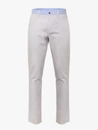 Calças Chino bege claro homem 100% algodão. Cós às riscas azuis e brancas. Corte regular, fecho de botão e fecho de correr oculto por carcela, dois bolsos laterais e um bolso pequeno. Dois bolsos com casa de botão abotoados atrás e presilhas para cinto.
