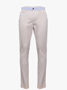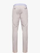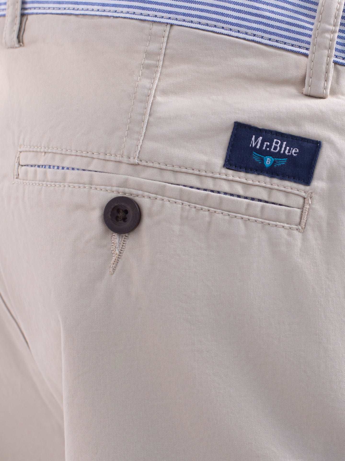 Calças chinos homem crú slim fit com cós às riscas azul e branco e bolso para moedas. Muito confortáveis, são a escolha certa para os dias mais quentes.