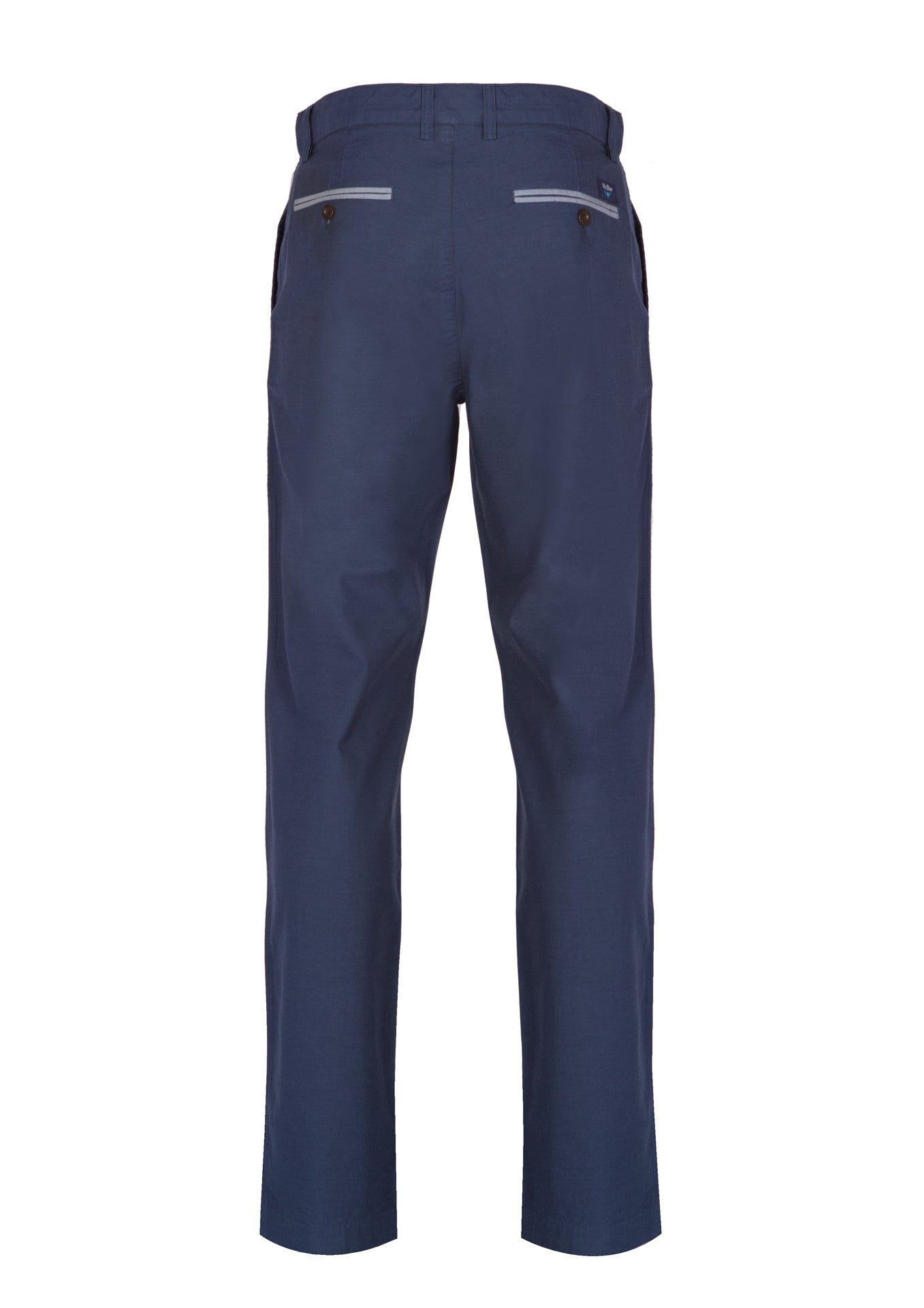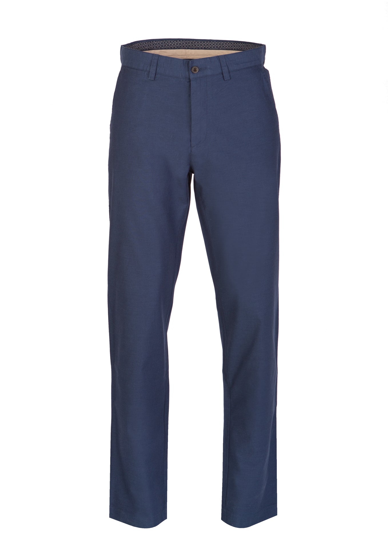 Calças Chinos Homem 100% Algodão Canvas azul escuro com detalhe no cós. Corte Tailored Fit. Muito confortáveis, são a escolha certa para os dias mais quentes.