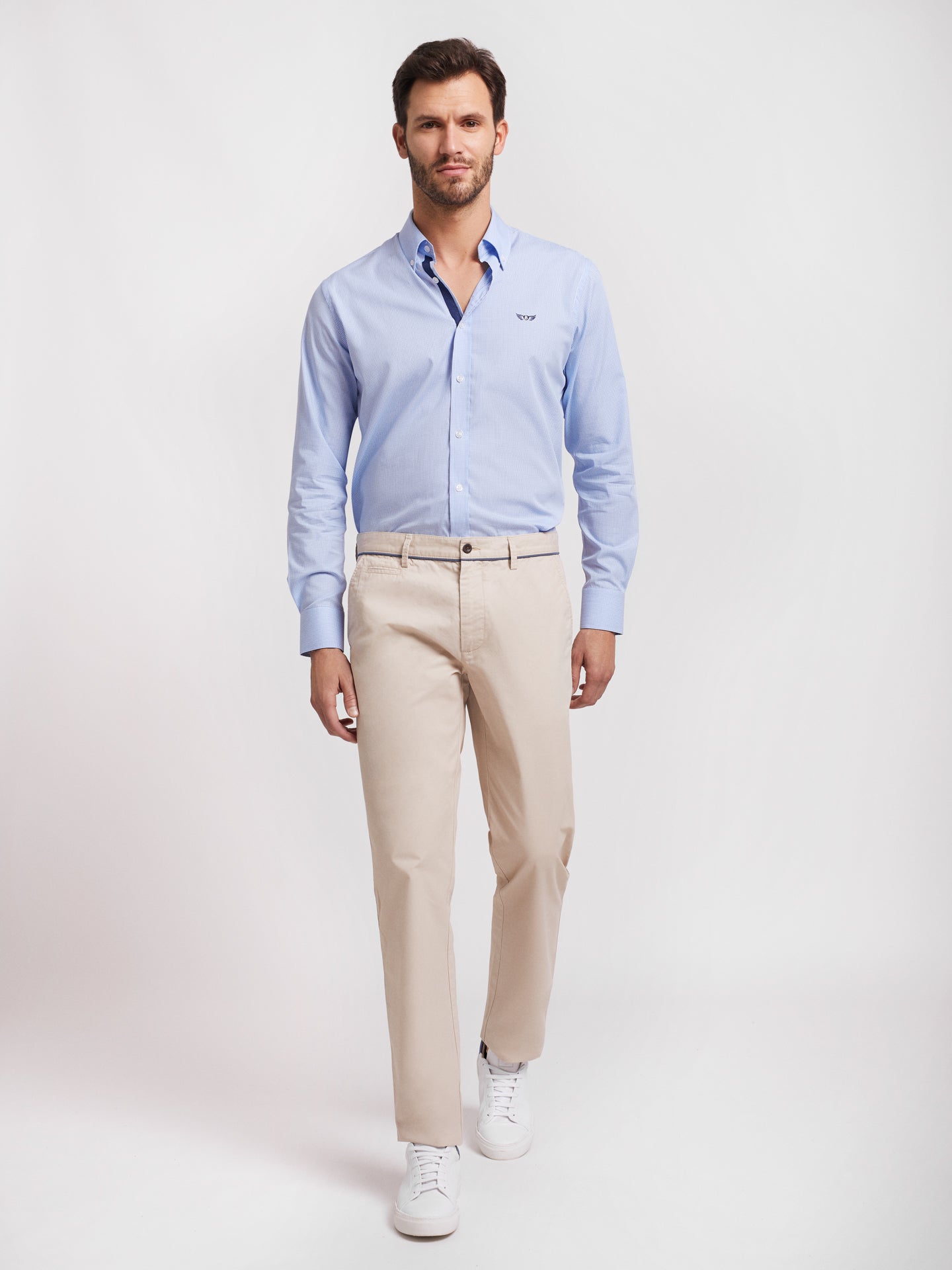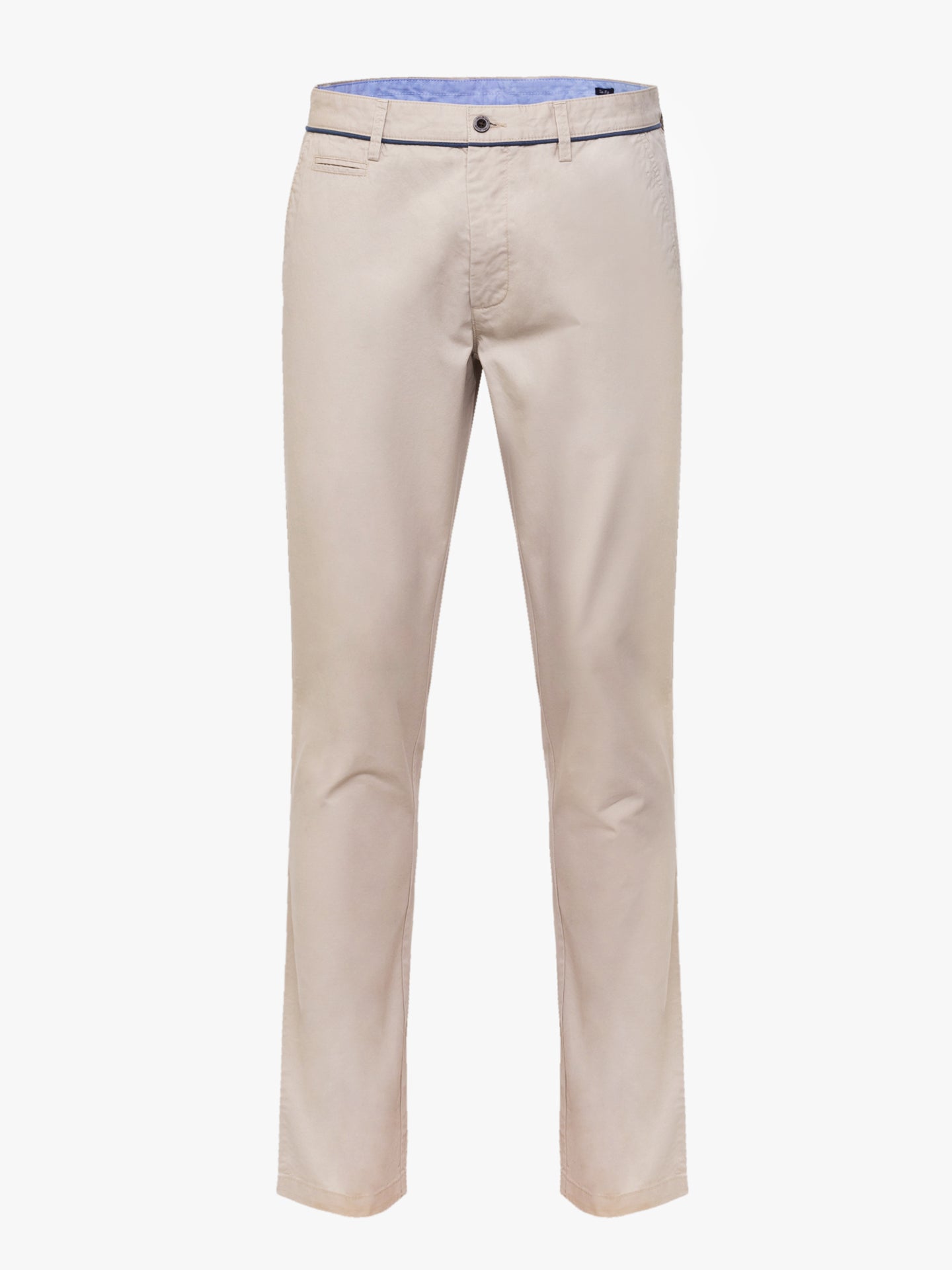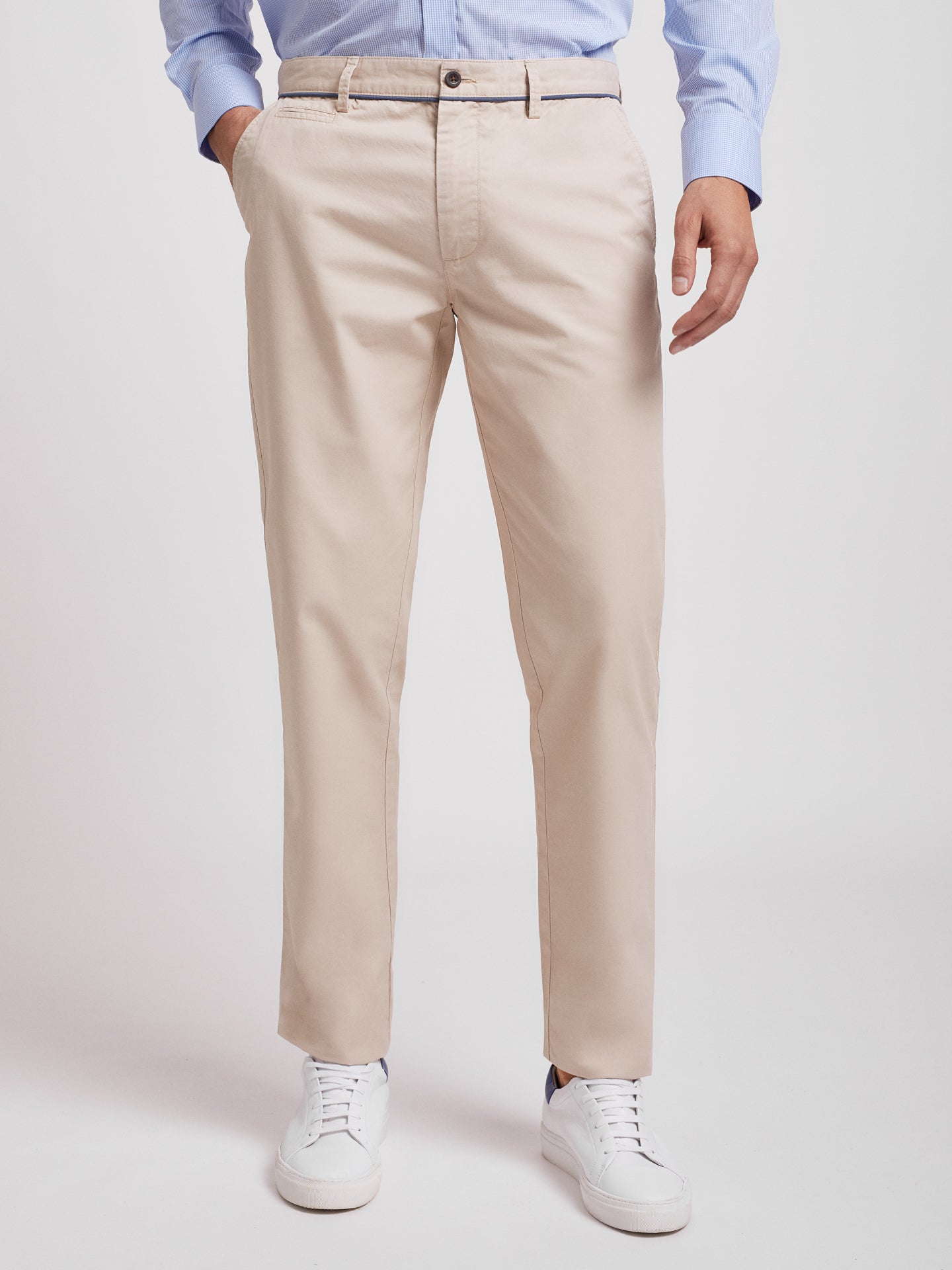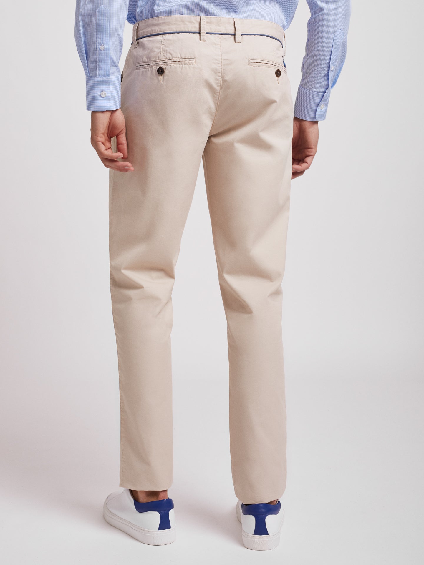 Calças Chino bege homem 100% algodão. Pormenor cós em azul médio. Corte slim, fecho de botão e fecho de correr oculto por carcela, dois bolsos laterais e um bolso pequeno. Dois bolsos com casa de botão abotoados atrás e presilhas para cinto.