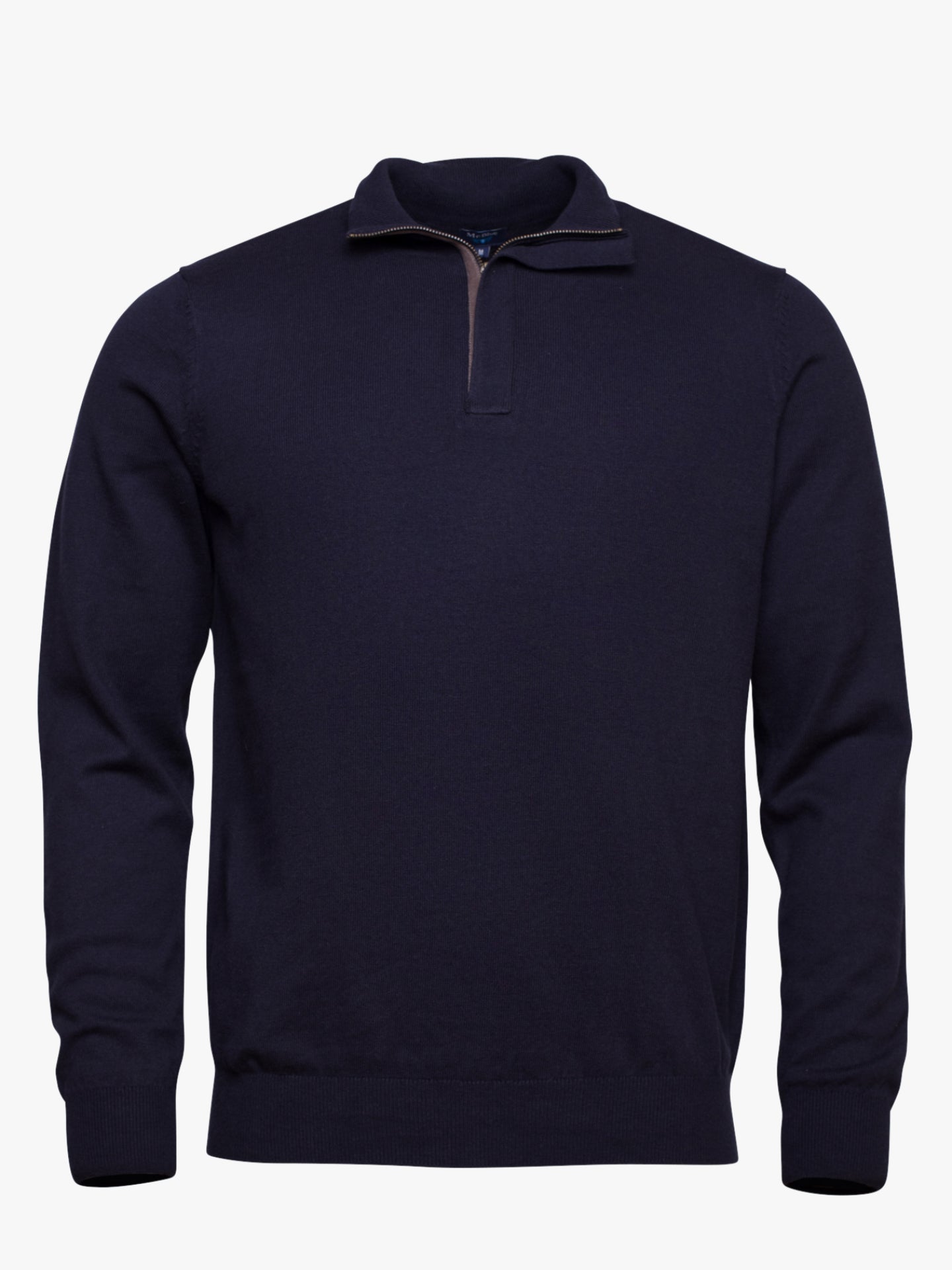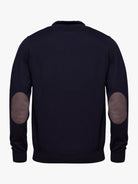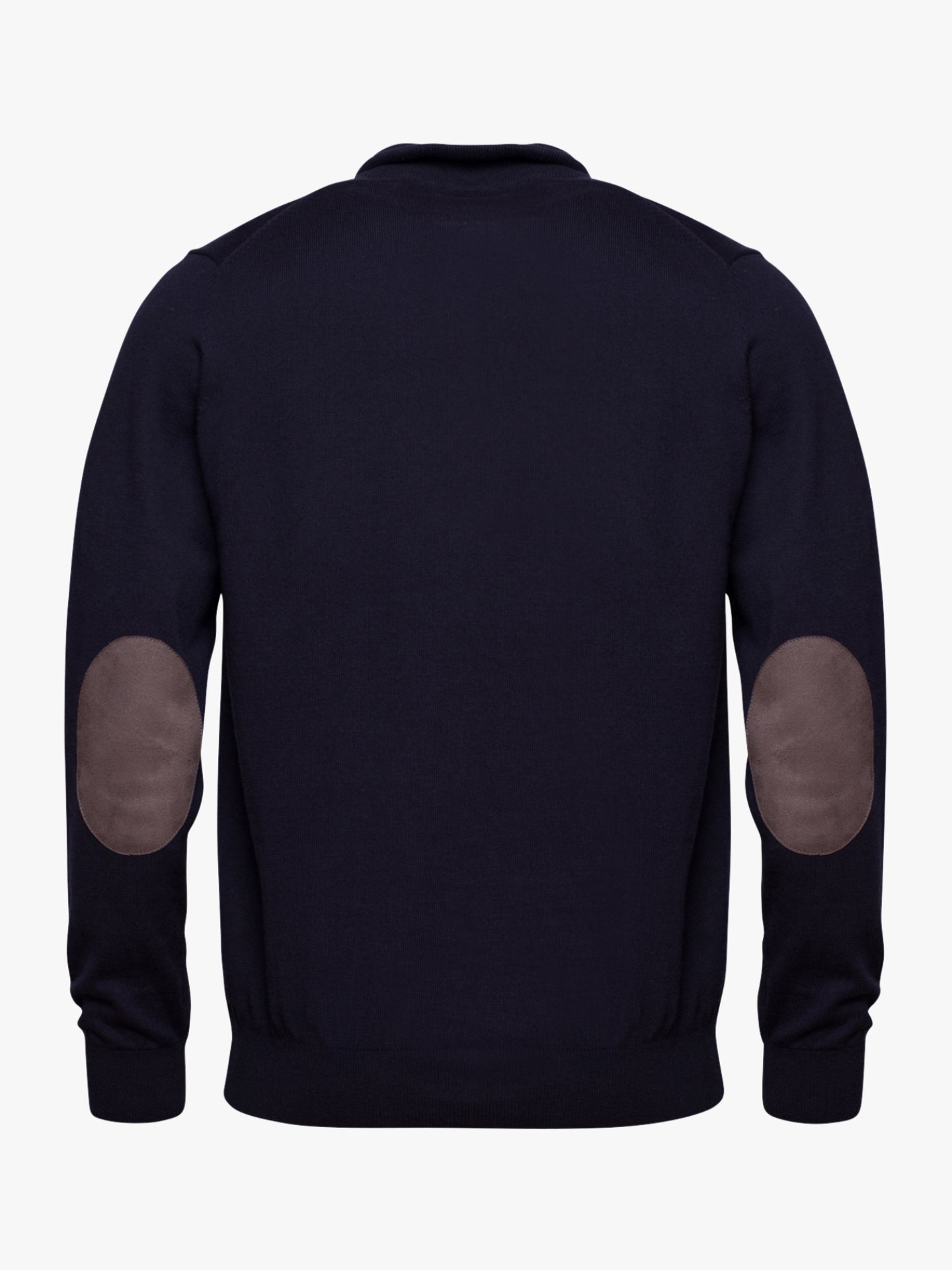 Camisola Homem algodão e caxemira azul escuro com cotoveleiras e gola com fecho de correr em camurça cinza. Peça indespensável no seu guarda roupa. Ideal para um fim de semana ou um dia de trabalho descontraído. Ideal para usar com uma Camisa Homem.