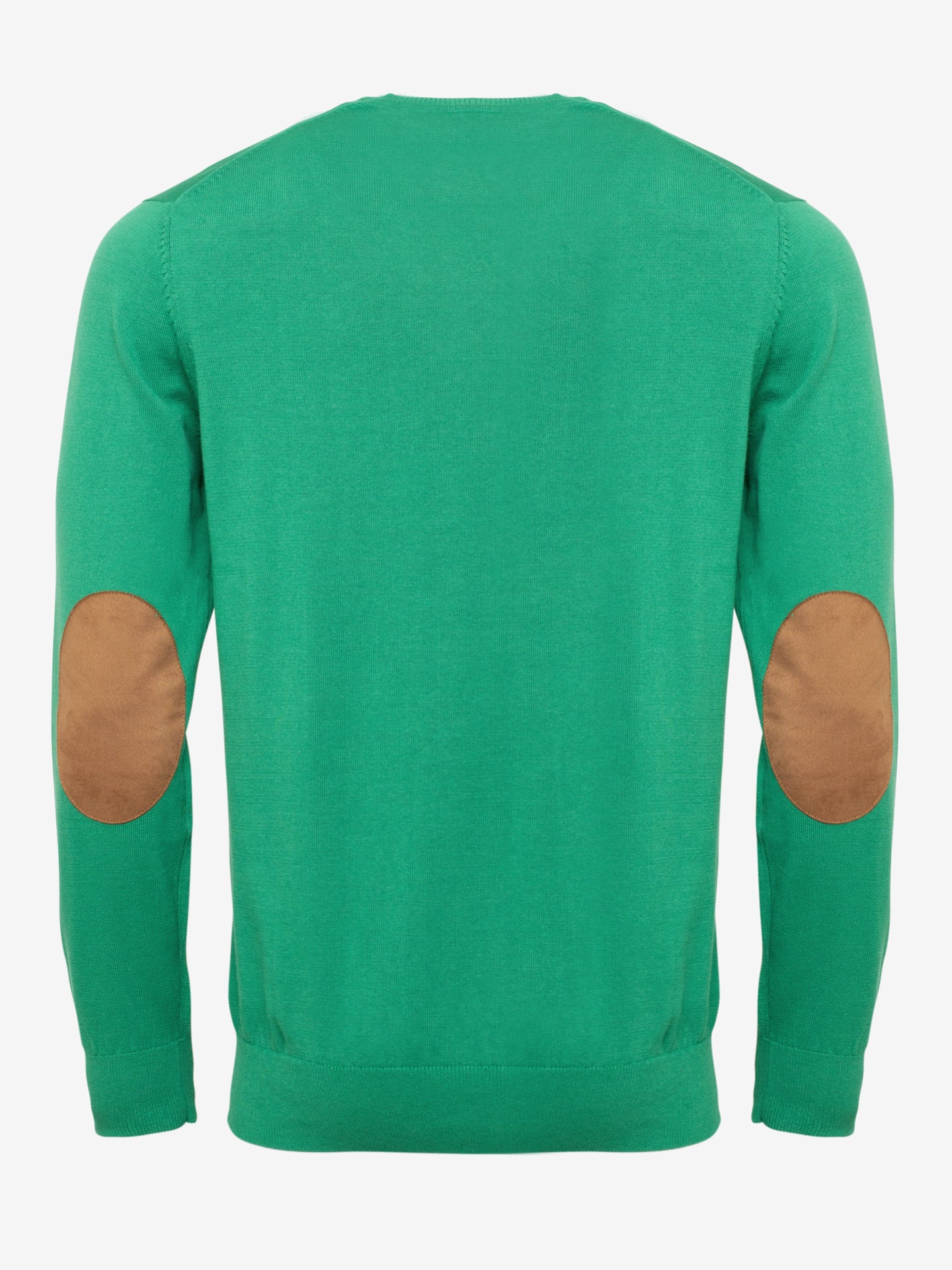 Camisola Homem algodão e caxemira verde intermédio com cotoveleiras. Peça indespensável no seu guarda roupa. Ideal para um fim de semana ou um dia de trabalho descontraído. Ideal para usar com uma Camisa Homem.