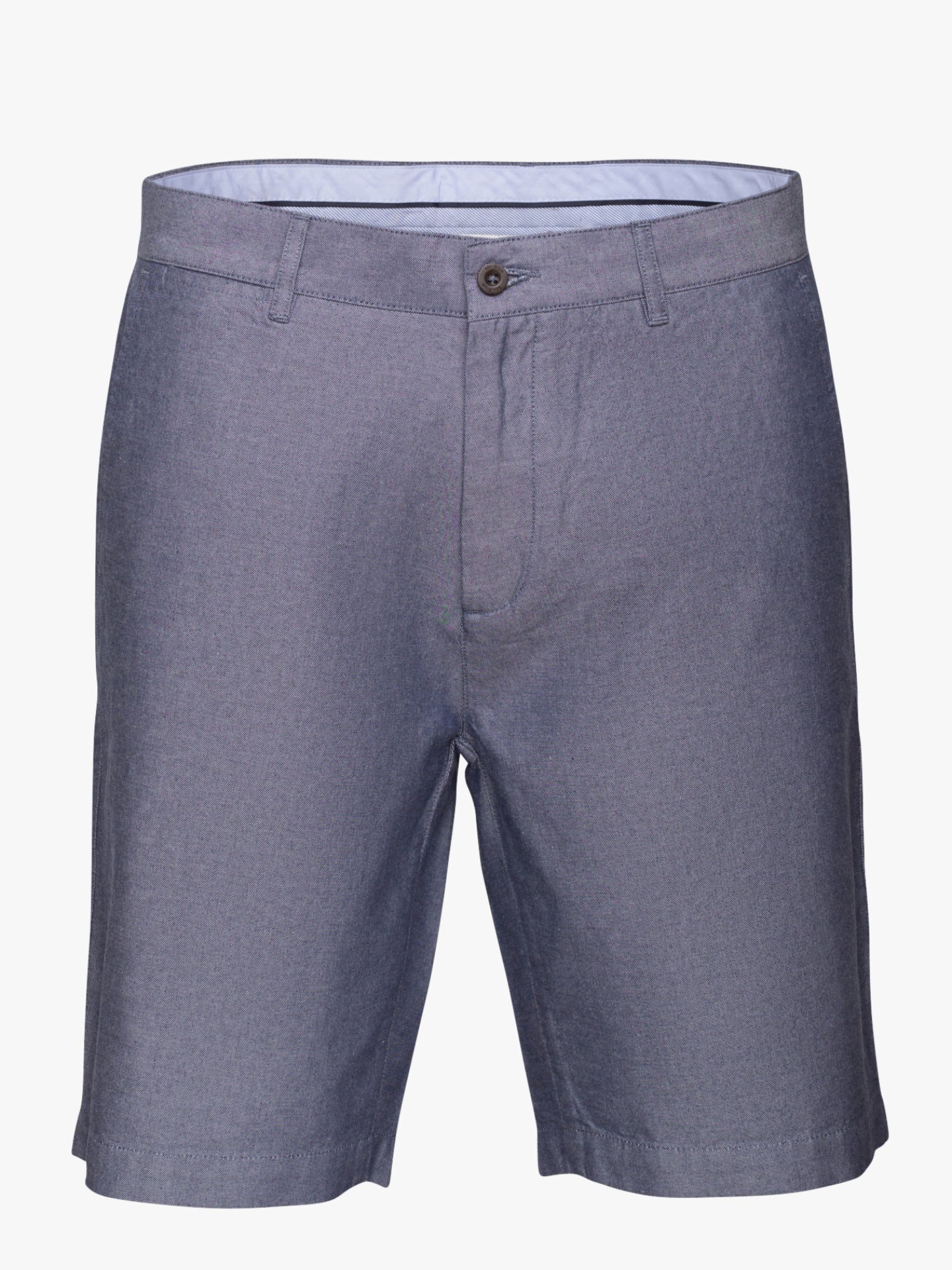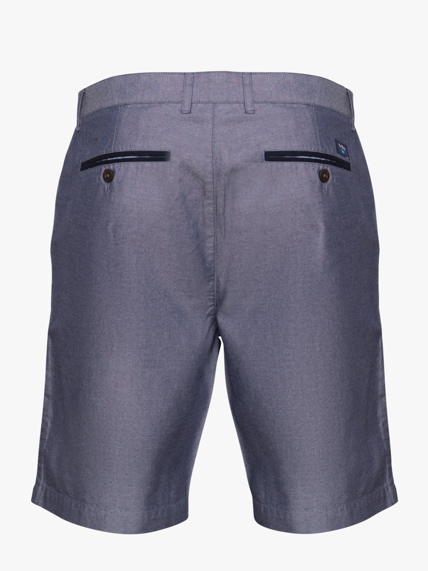 Calções bermuda Homem 100% Algodão Oxford falso liso azul cinza com interior cós riscas e mil raias azul e branco. Detalhe bolsos traseiros em Twill em azul marinho Ideais para dias mais quentes ou para fim-de-semana descontraído