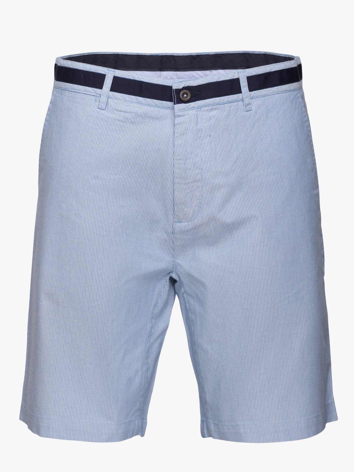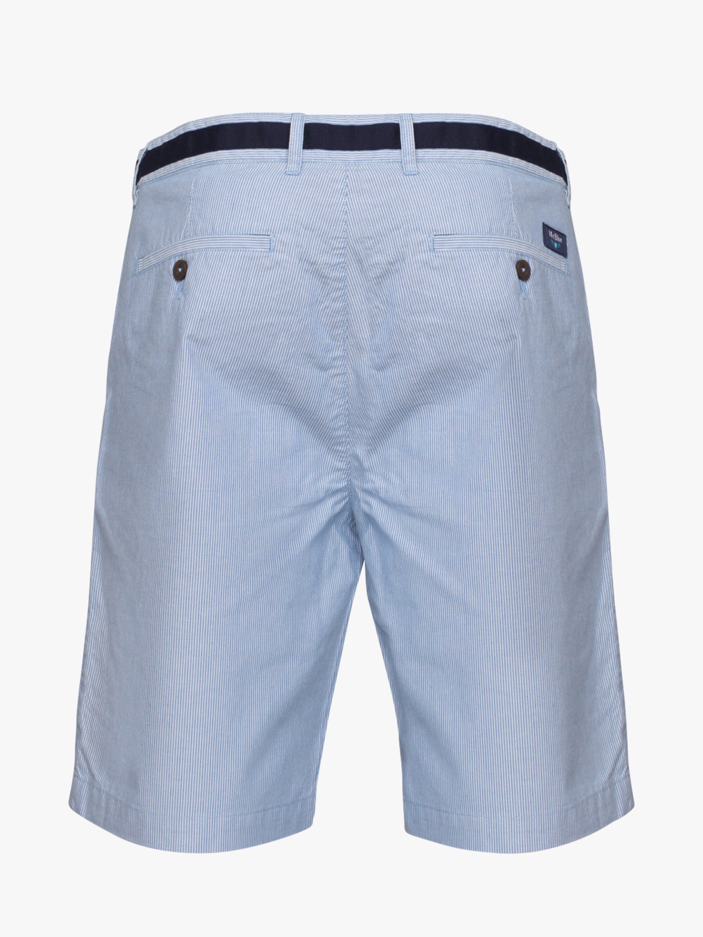 Calções bermuda Homem 100% Algodão Oxford riscas finas azul claro e branco com tape no cós em azul marinho Ideais para dias mais quentes ou para fim-de-semana descontraído