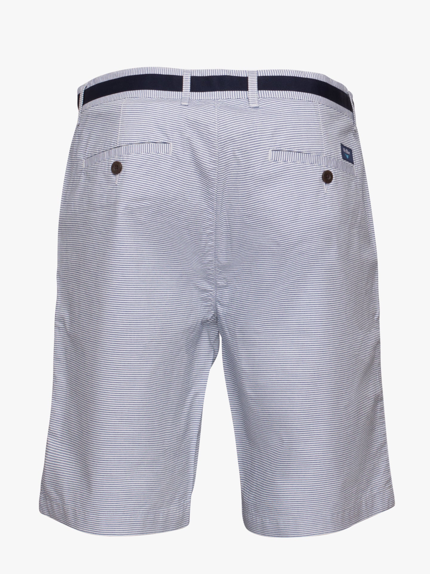 Calções bermuda Homem 100% Algodão Oxford riscas finas azul denim e branco com detalhe cós em azul marinho. Tape interior cós em azul marinho e mil raias azul claro e branco Ideais para dias mais quentes ou para fim-de-semana descontraído