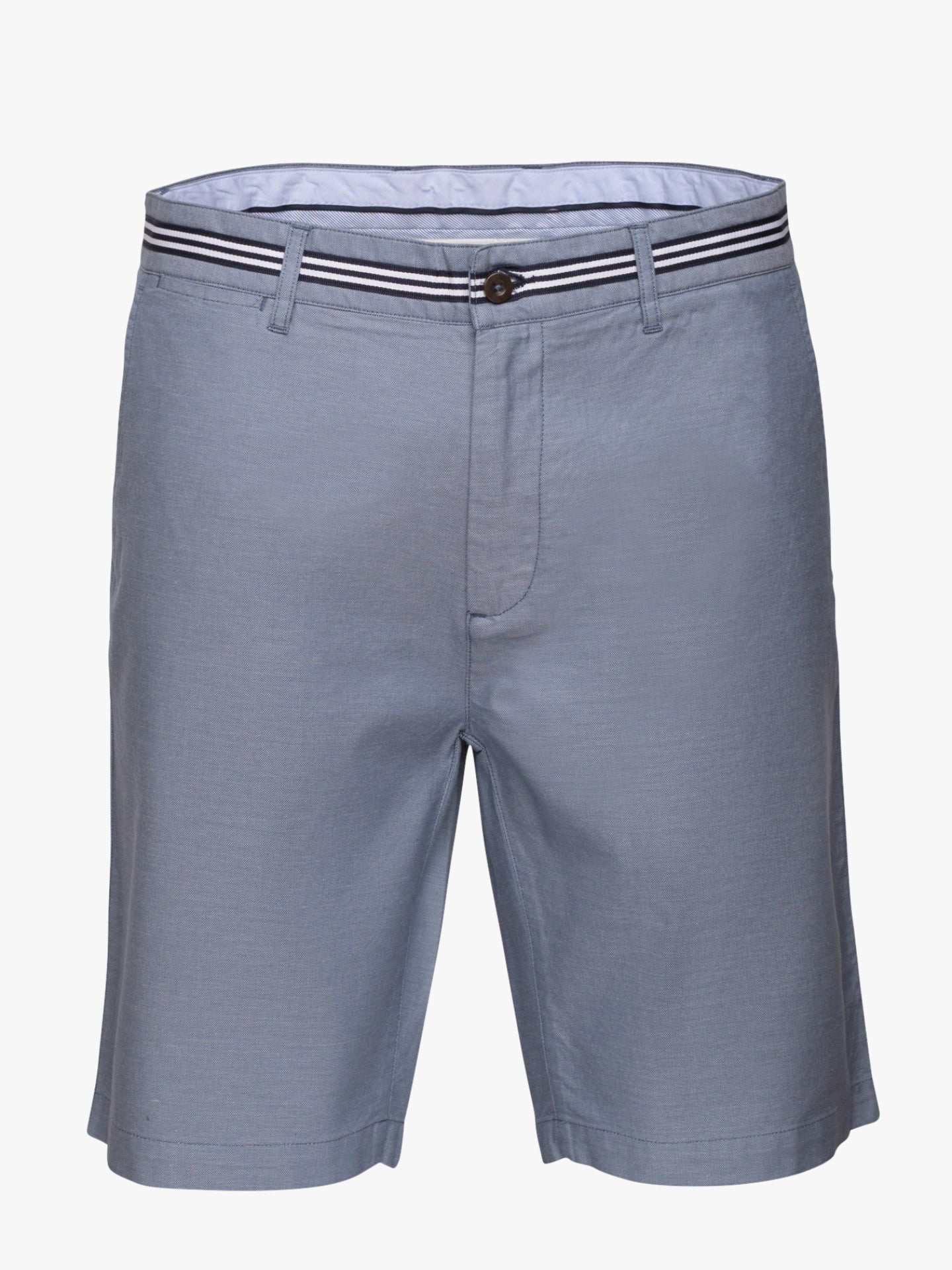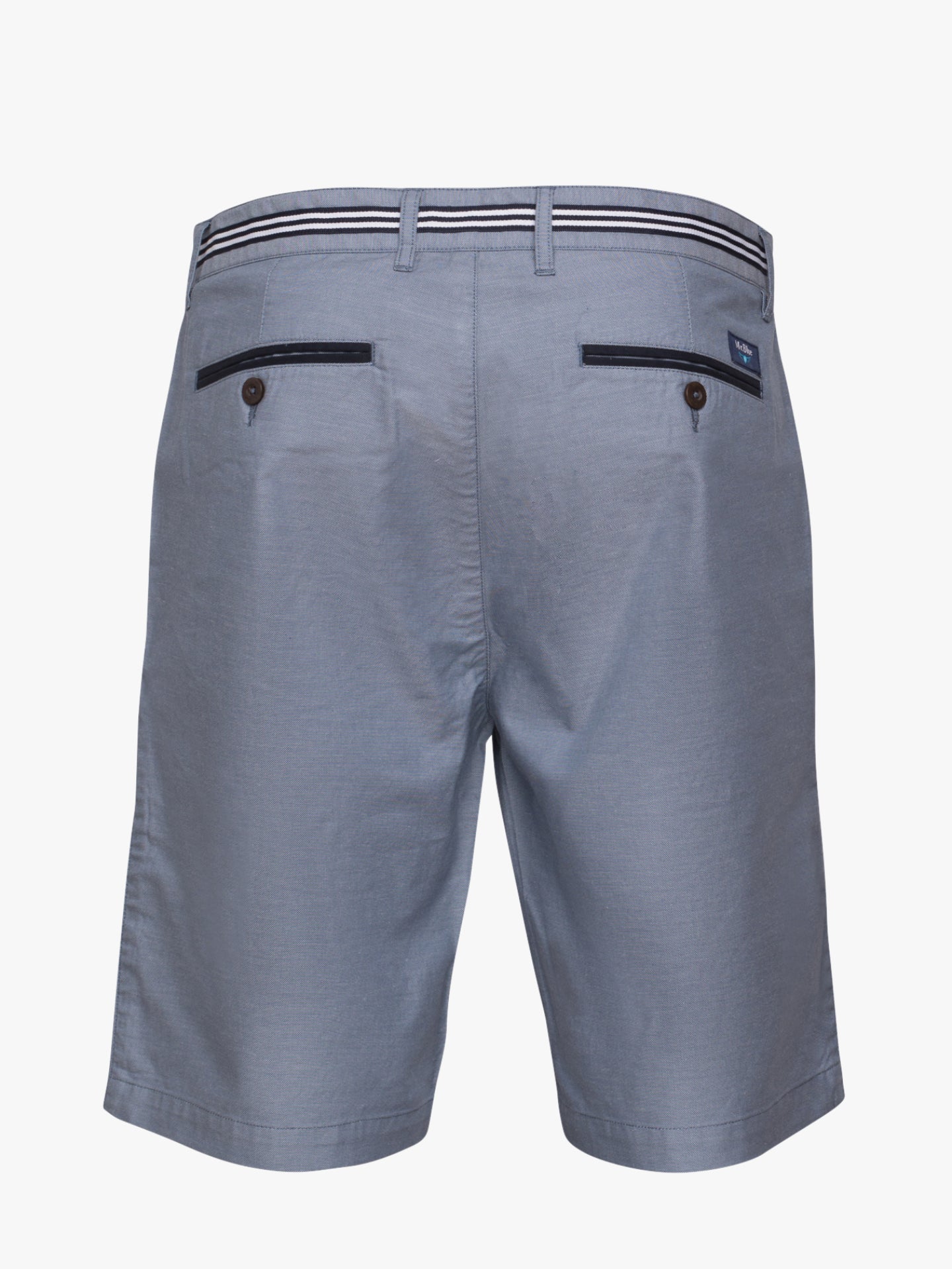 Calções bermuda Homem 100% Algodão Oxford azul médio com tape no cós em azul marinho e branco + detalhe bolso traseiro em twill azul escuro Ideais para dias mais quentes ou para fim-de-semana descontraído