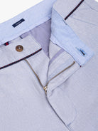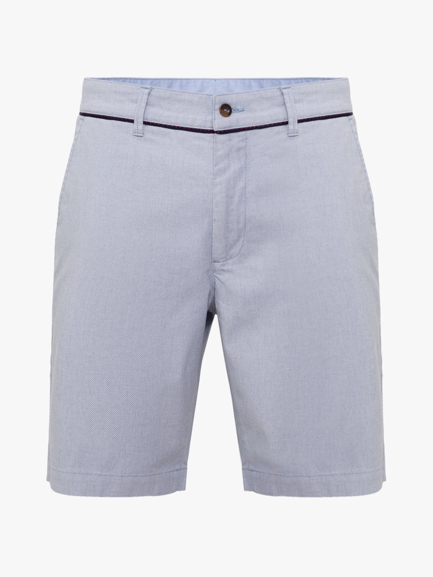 Calções bermuda Chino azul claro homem. Calções bermuda homem em algodão com pormenor no cós em azul marinho e vermelho. Corte regular, fecho de botão e fecho de correr oculto por carcela, dois bolsos laterais. Dois bolsos com casa de botão abotoados atrá