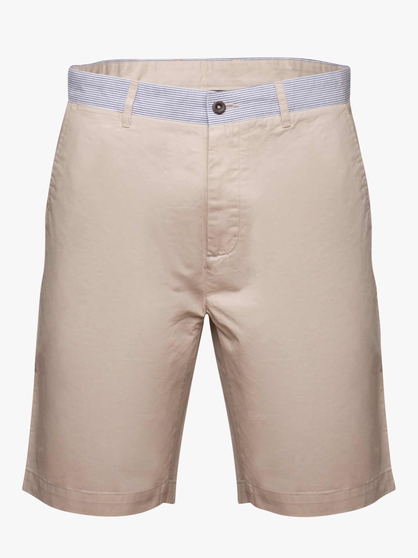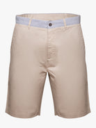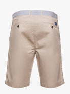 Calções bermuda Homem 100% Algodão Twill beje com detalhe no cós em cru e azul. Ideais para dias mais quentes ou para fim-de-semana descontraído