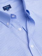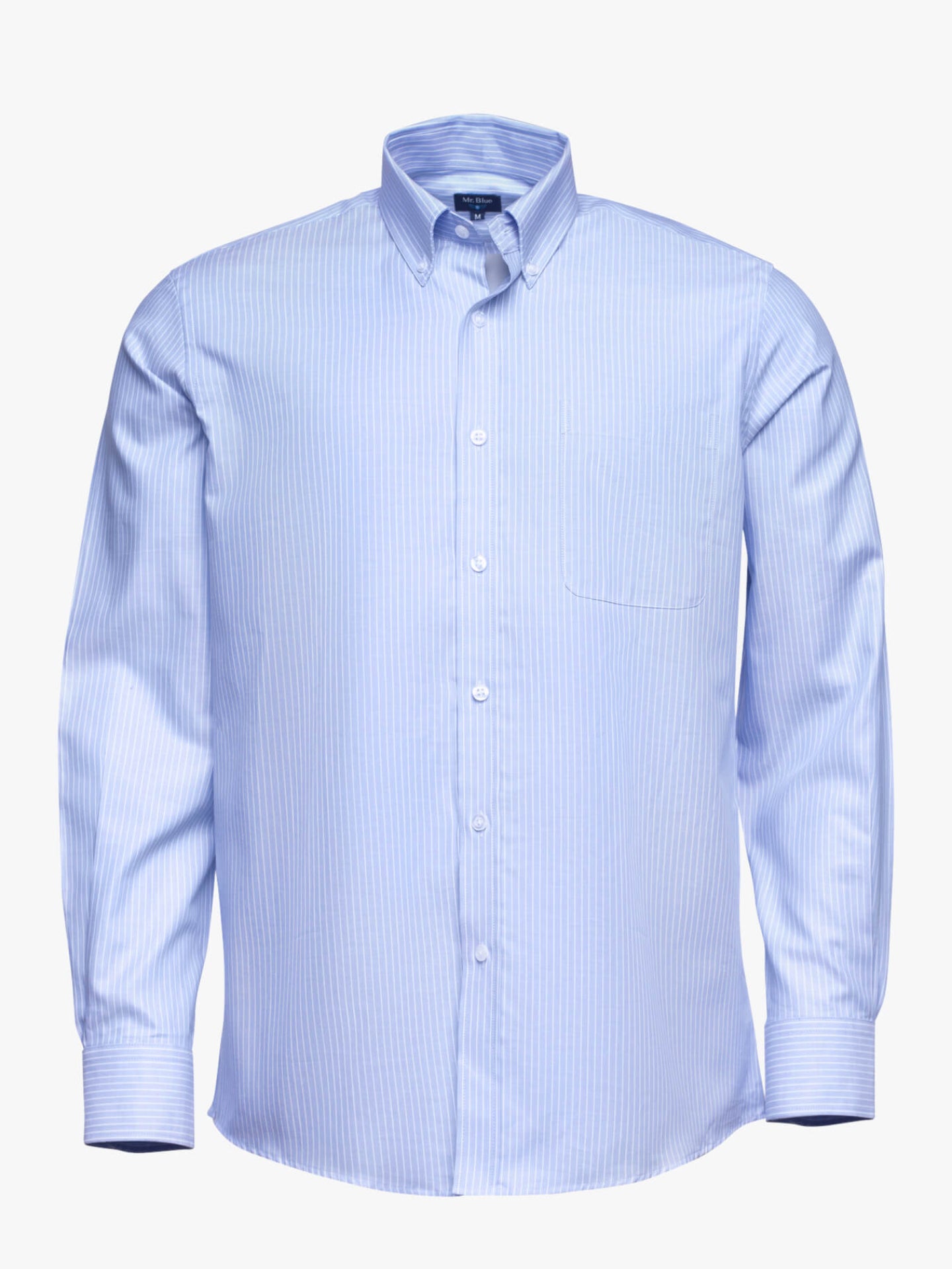 Camisa algodão para homem riscas finas azul médio com bolso. Confecionada em tecido 100% algodão, colarinho abotoado, manga comprida. Fabricada com fibras naturais, esta camisa poderá ser usada com umas calças de ganga ou chinos, para um look mais informa