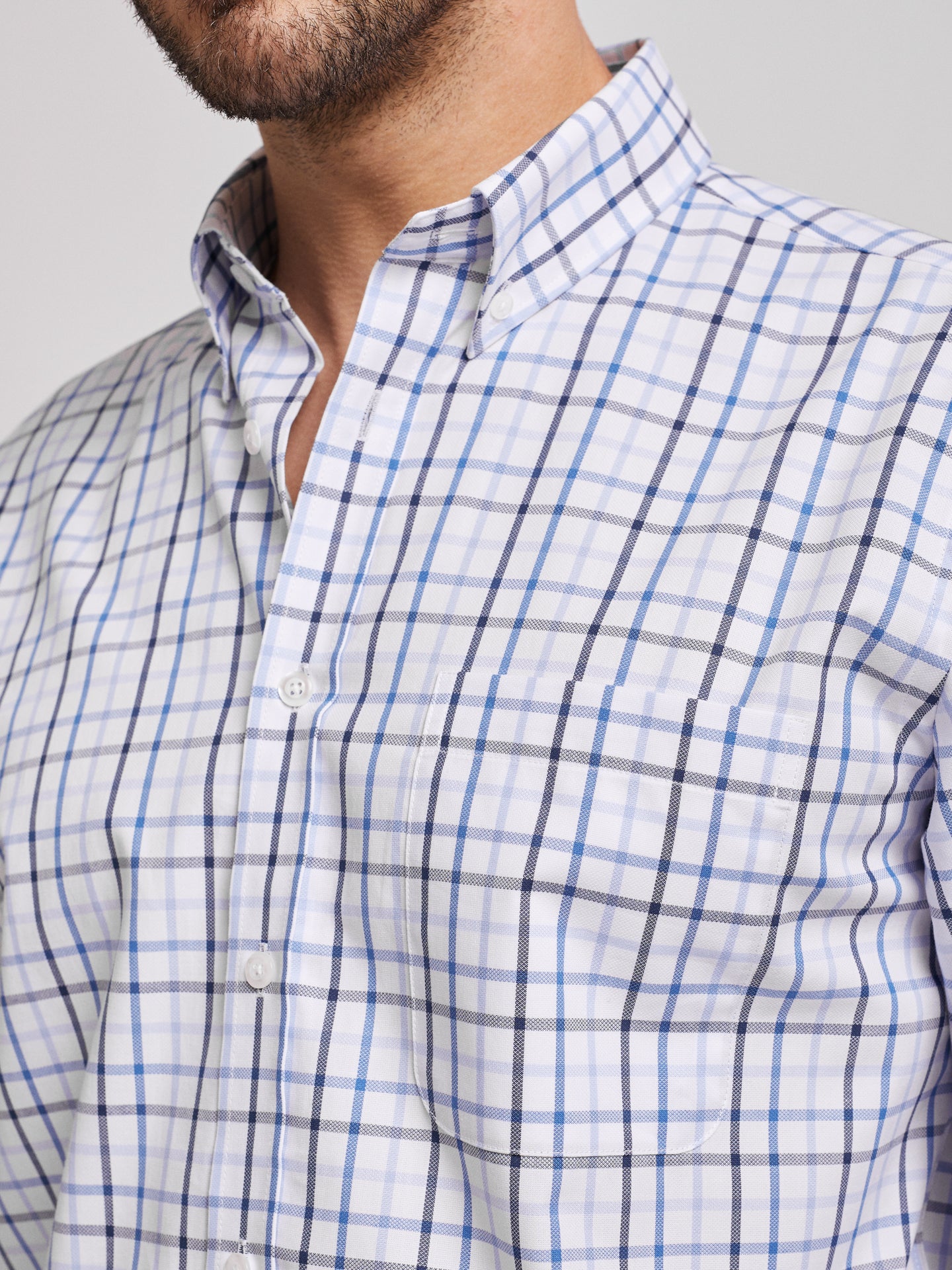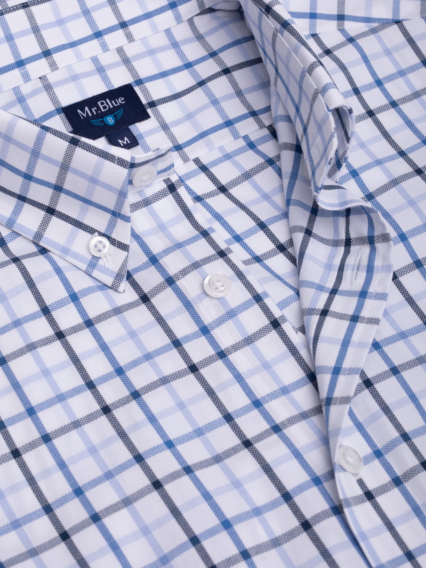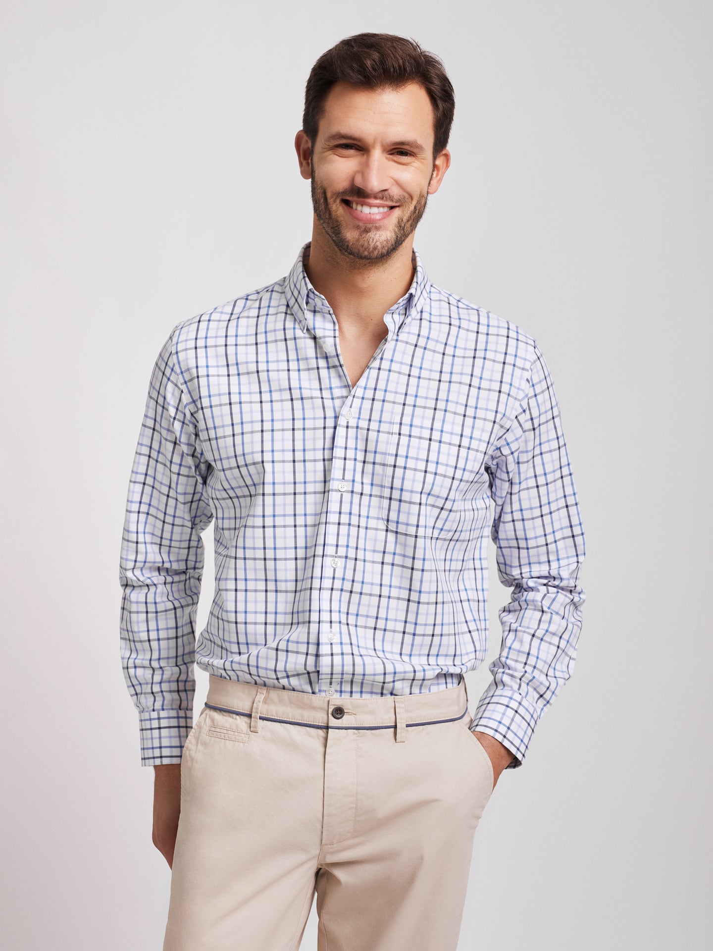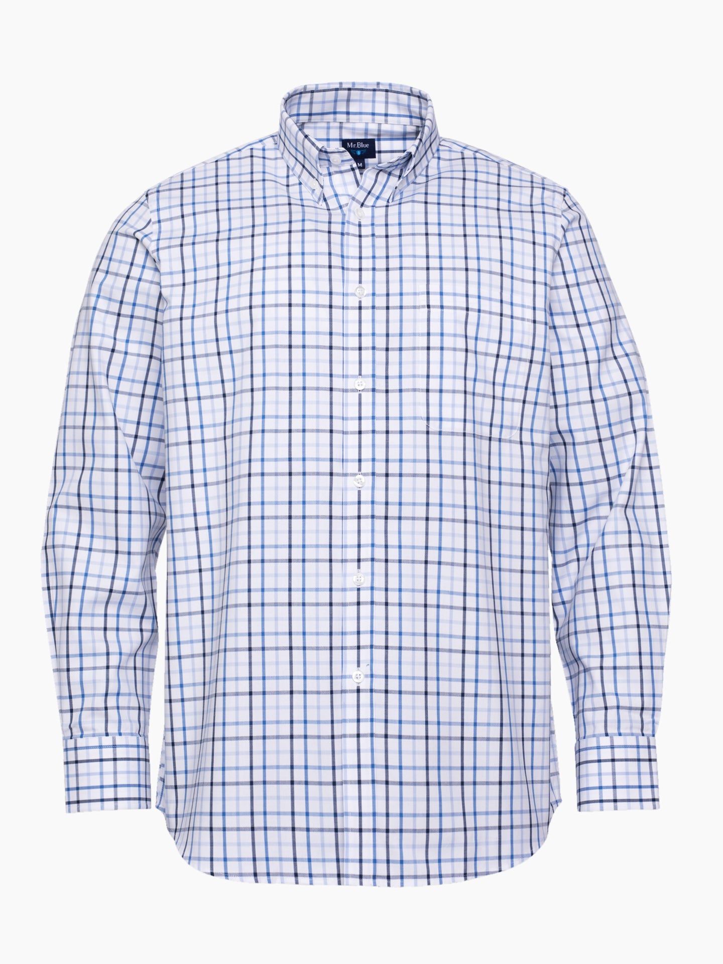 Camisa oxford homem quadrados branco e azul com bolso. Confeccionada em algodão. Corte regular fit.Gola abotoada. Fecho com botões. Punhos abotoados