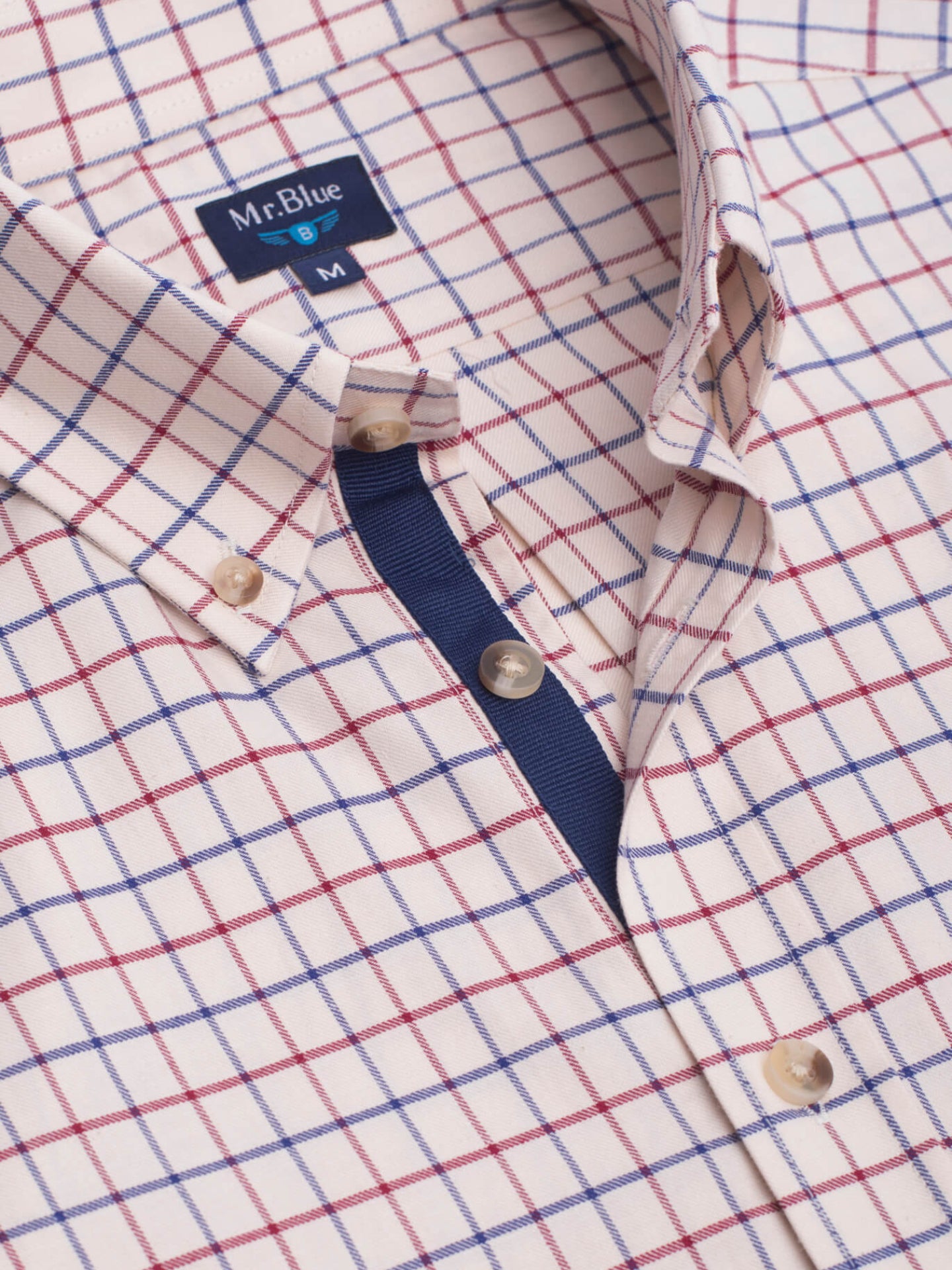 Camisa algodão aos quadrados azul escuro e bordeaux com bolso e detalhes