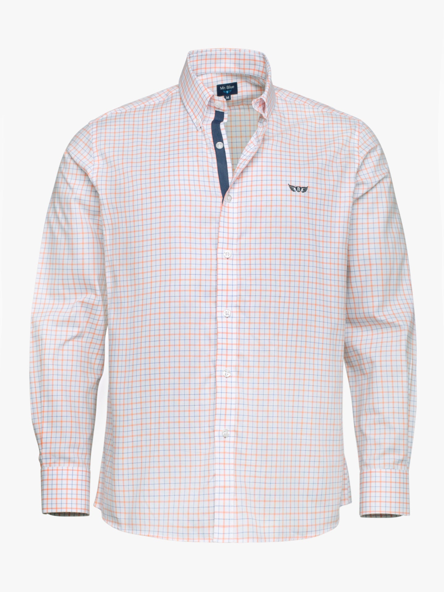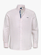 Camisa de homem 100% algodão Oxford quadrados pequenos branco e vermelho com logo bordado em azul marinho. Corte regular, fecho mediante abotoadura frontal, tape na carcela e manga comprida com acabamento em punho abotoado. Perfeita para o dia-a-dia, a ca