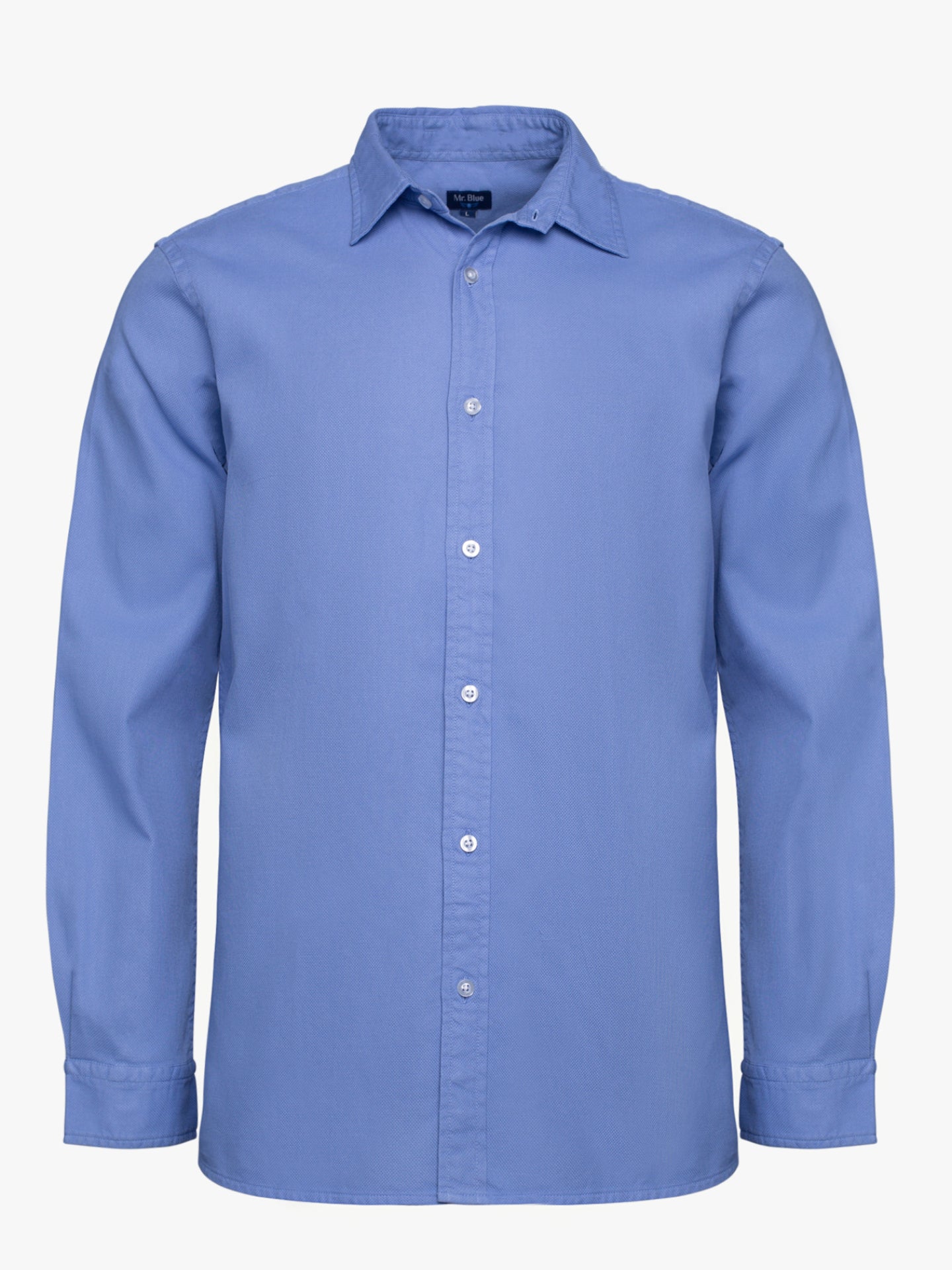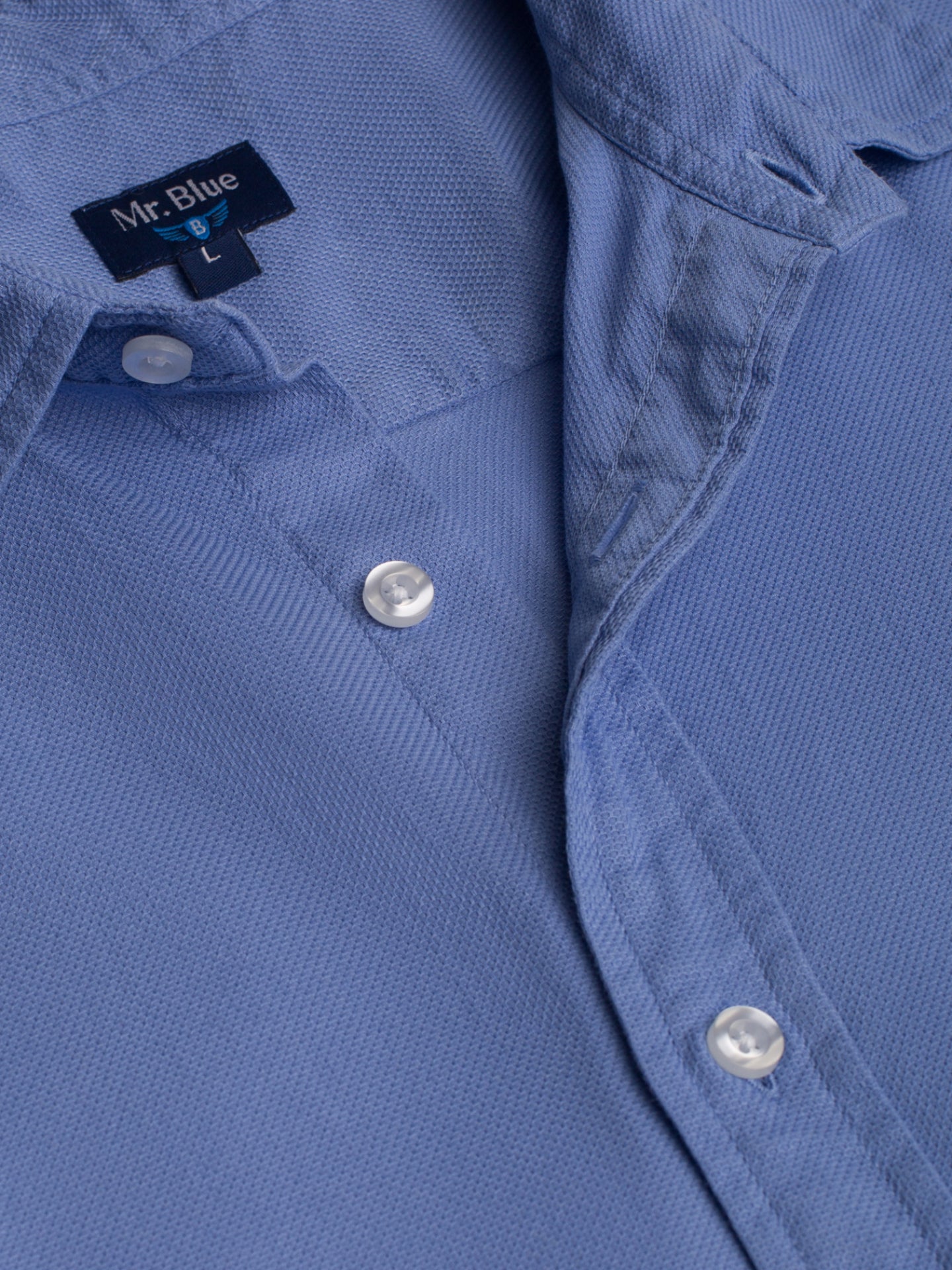 Camisa de homem 100% algodão azul intermédio com logo bordado em vermelho. Corte tailored, colarinho italiano, fecho mediante abotoadura frontal e manga comprida com acabamento em punho abotoado.