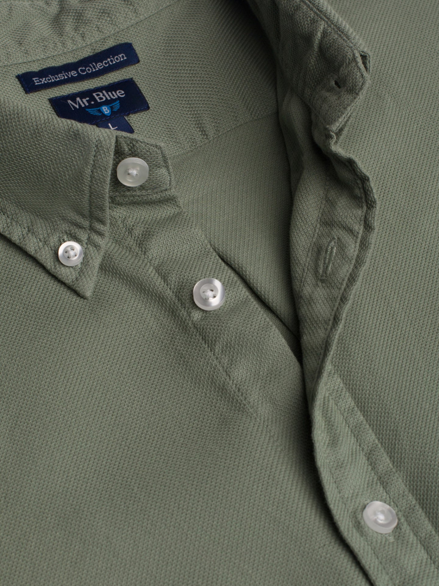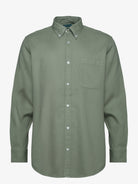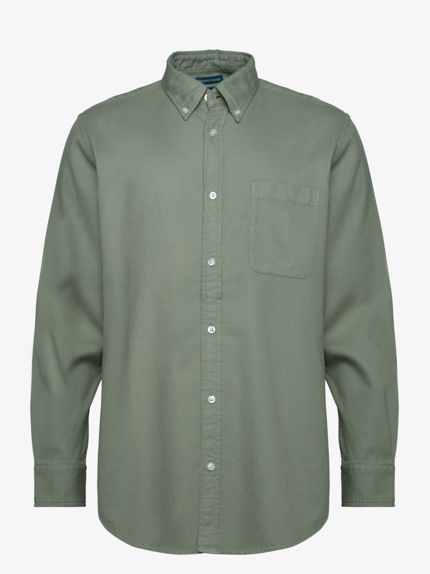 Camisa de homem 100% algodão verde seco. Efeito lavado, corte regular, colarinho italiano, fecho mediante abotoadura frontal e manga comprida com acabamento em punho abotoado.