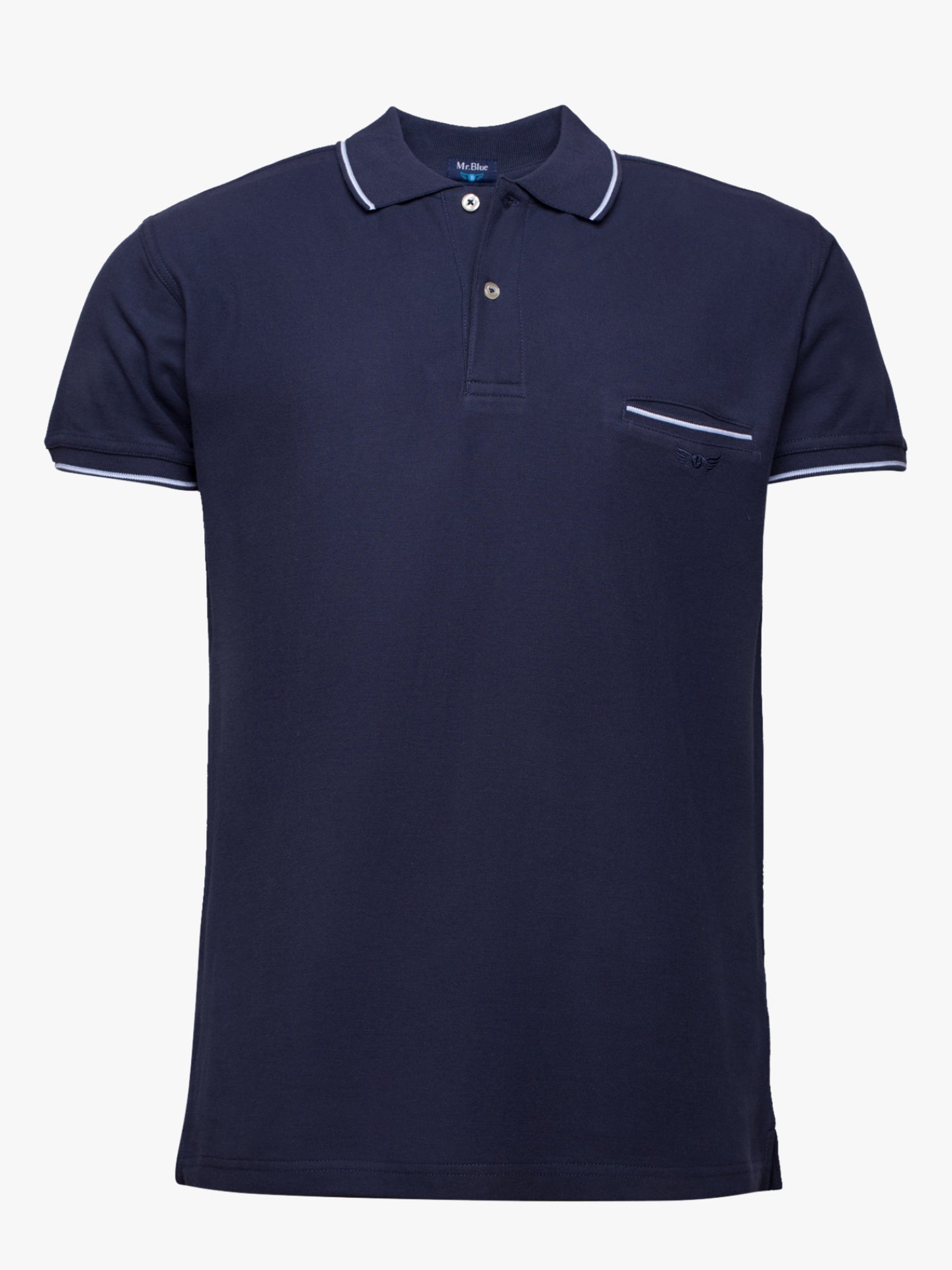 Pólo piquet Homem algodão manga curta azul escuro com bolso, logo bordado em azul marinho e detalhe rib bolso, gola e manga em azul escuro, azul claro e branco