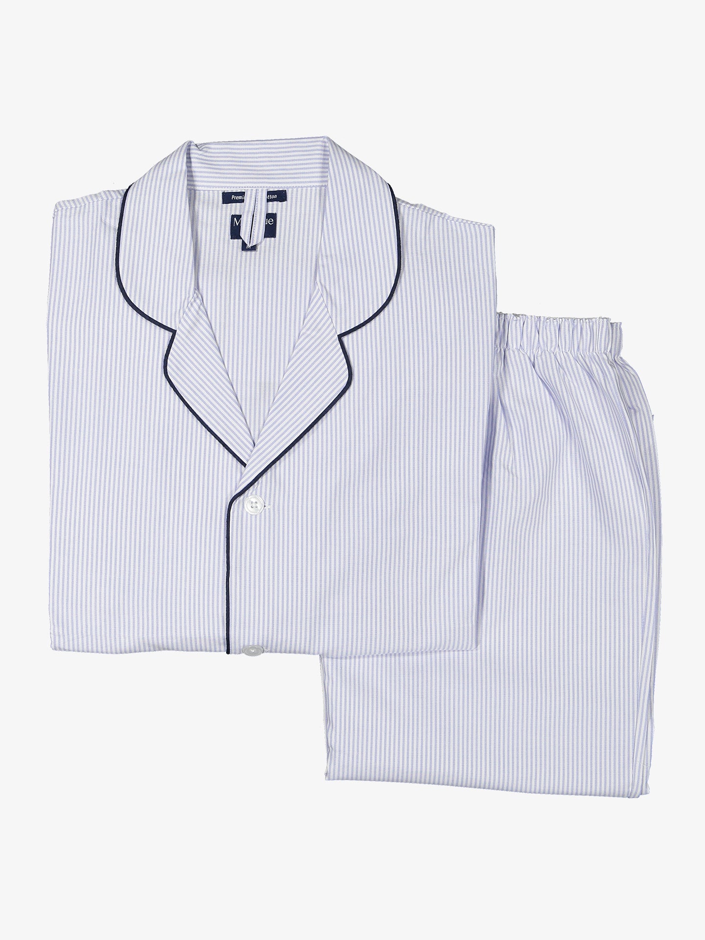 Pijama clássico manga comprida de riscas finas azul claro e branco