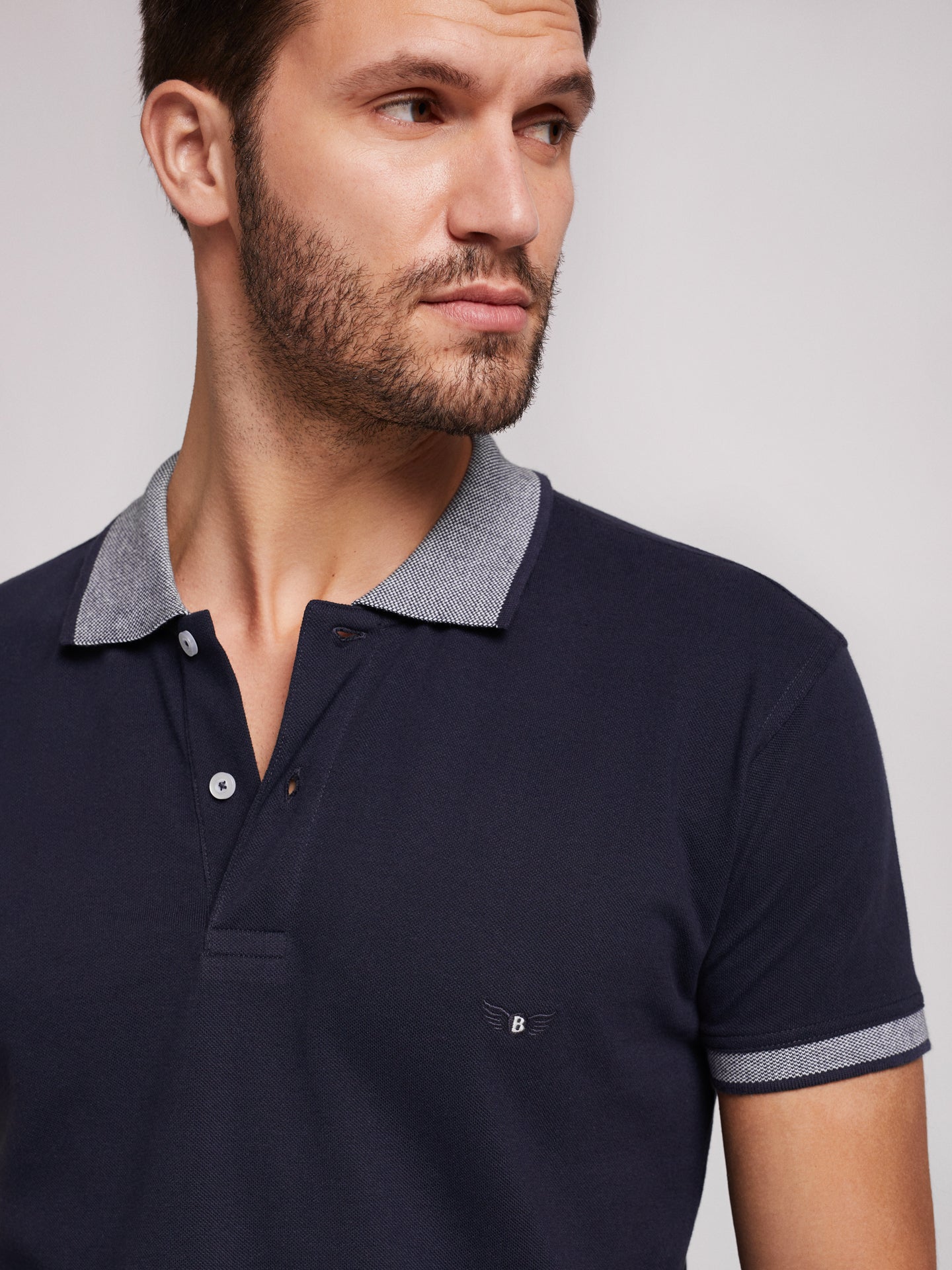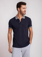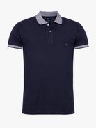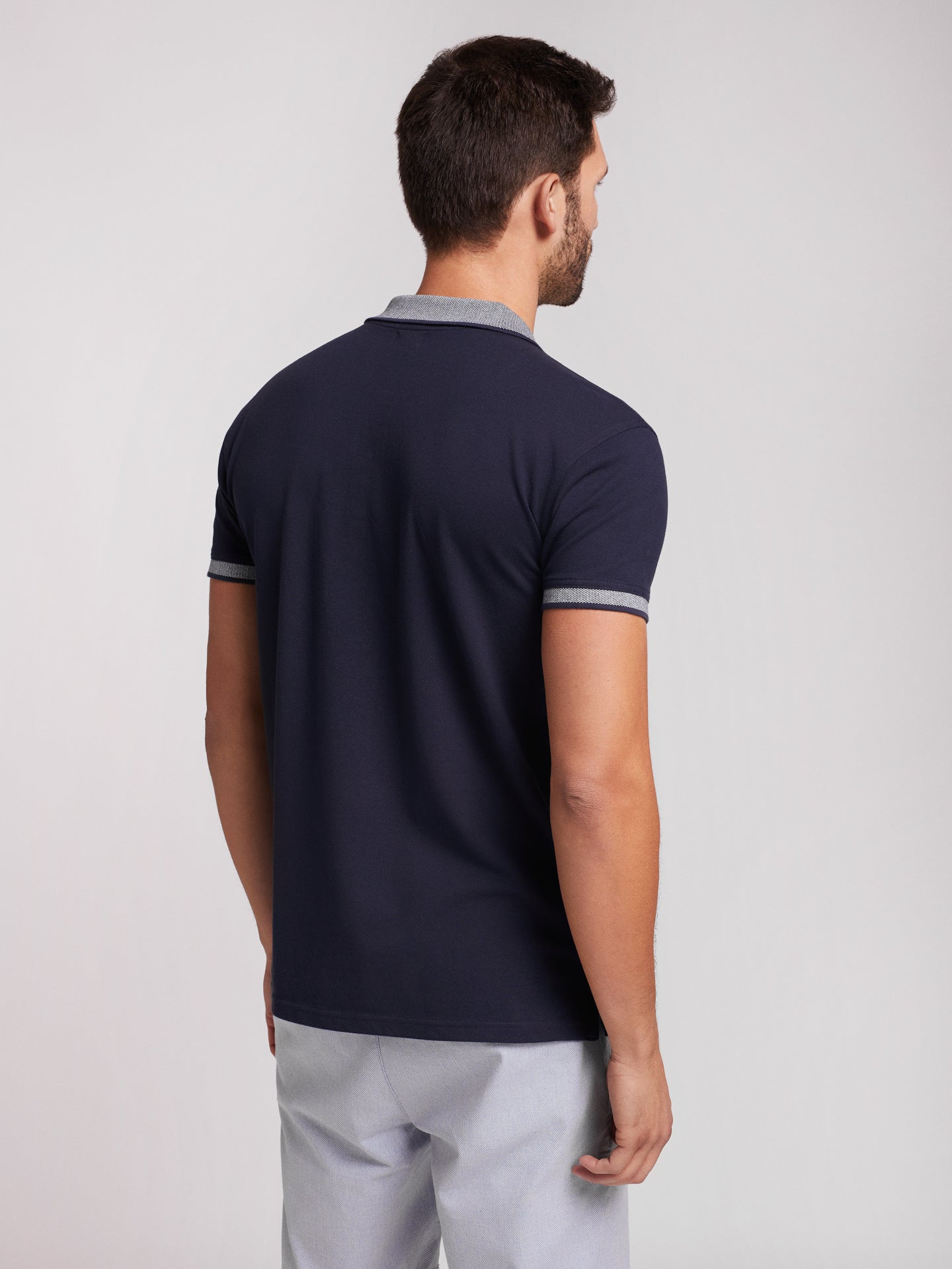 Polo piquet azul escuro homem manga curta. Gola e rib mangas em padrão branco e azul marinho. Fecho mediante carcela de 2 botões. Bainha com aberturas laterais