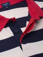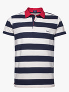 Pólo Rugby Homem manga curta riscas largas azul escuro e branco com logo