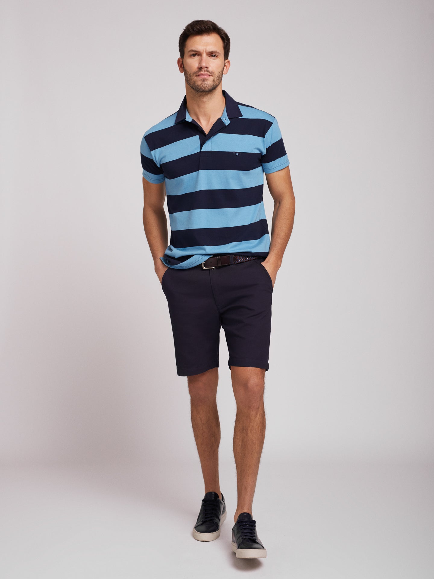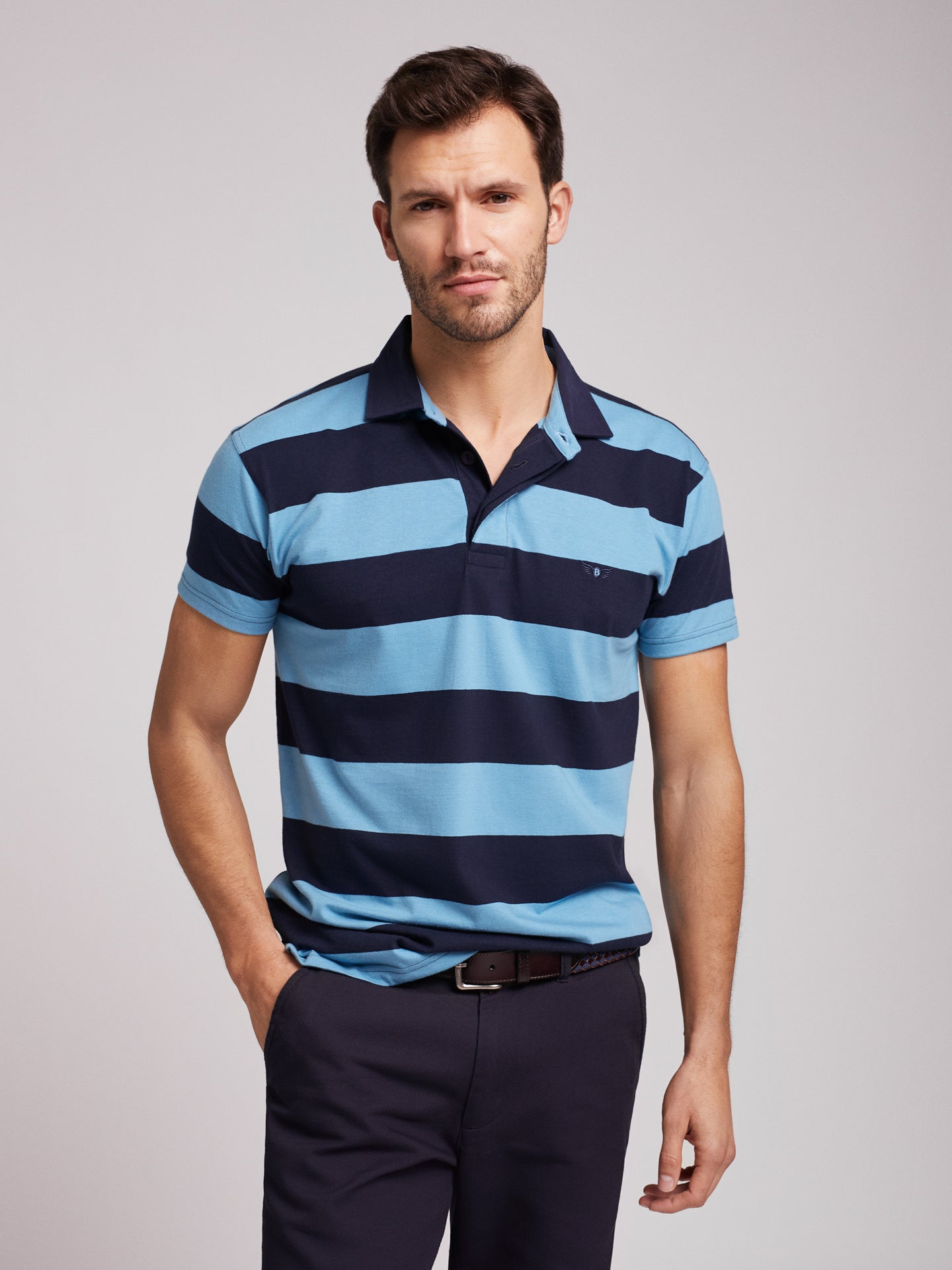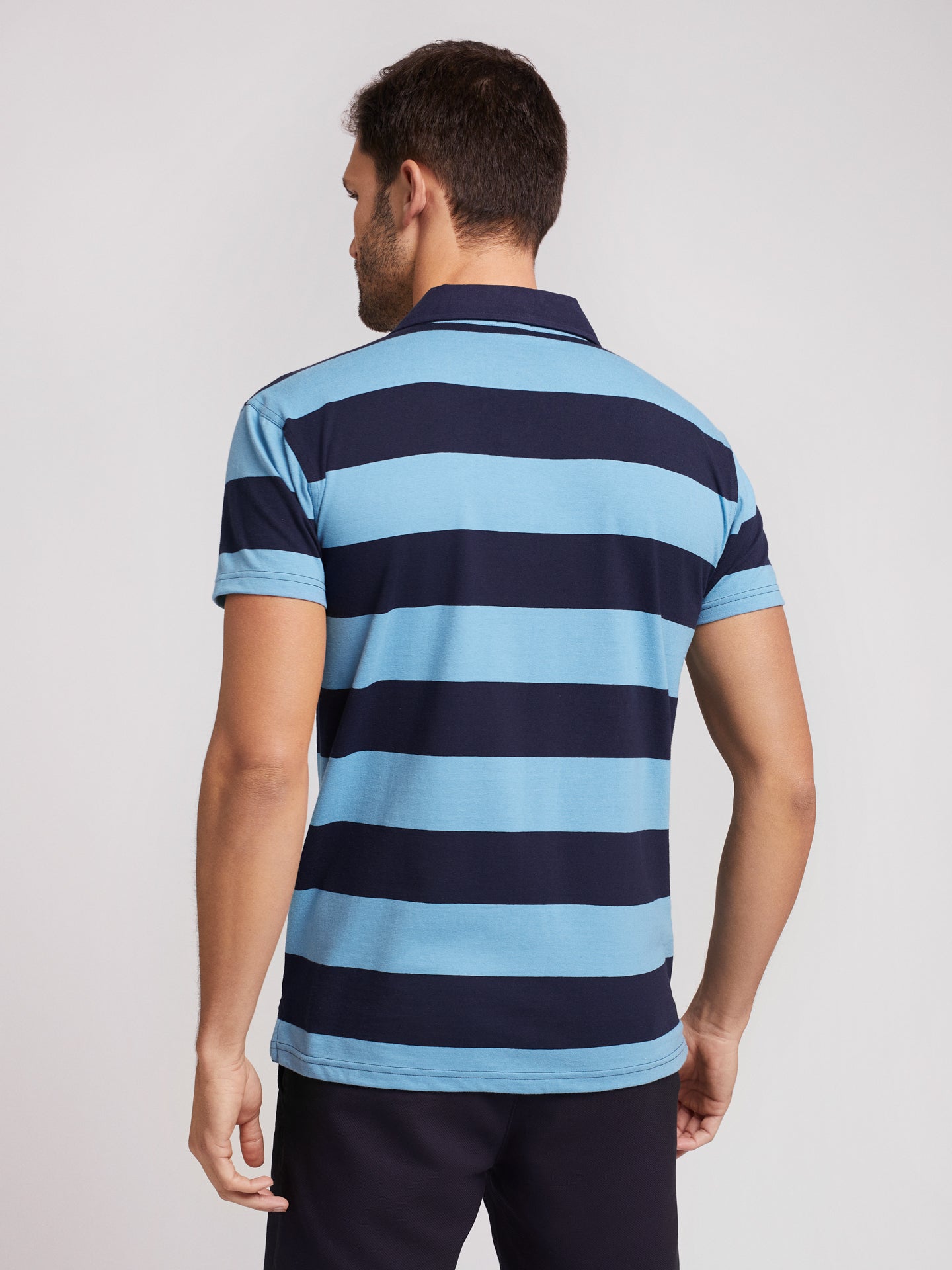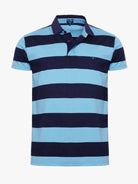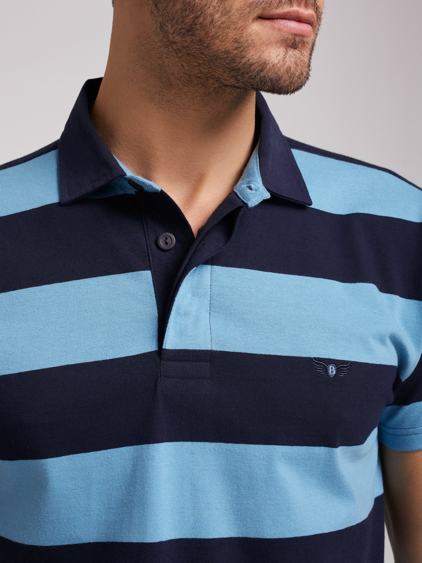 Pólo rugby homem às riscas grossas tons de azul, 100% algodão. Fecho mediante carcela de 3 botões. Bainha com aberturas laterais