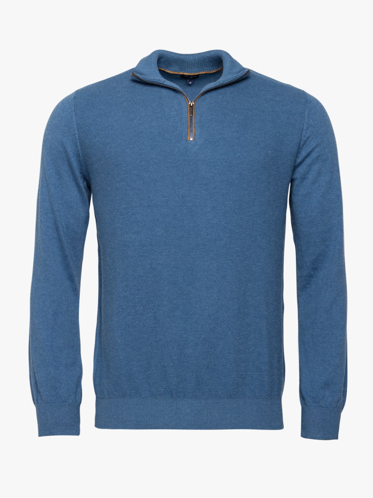 Camisola Homem Regular Fit Algodão e Caxemira Azul Meia Gola com zipper.