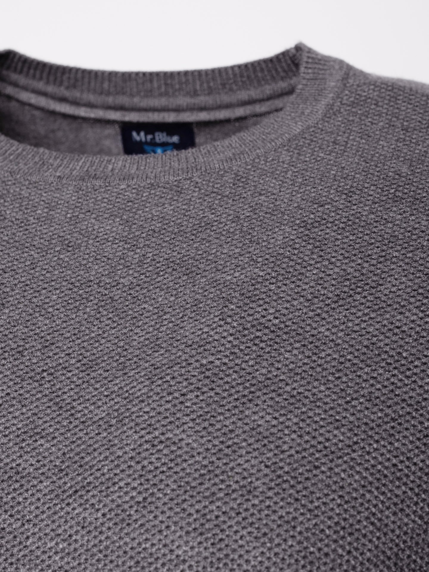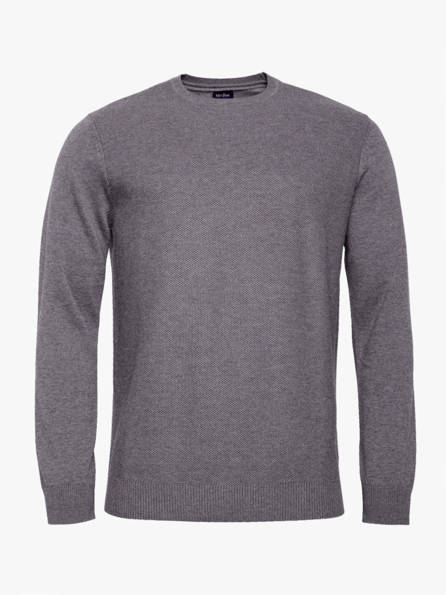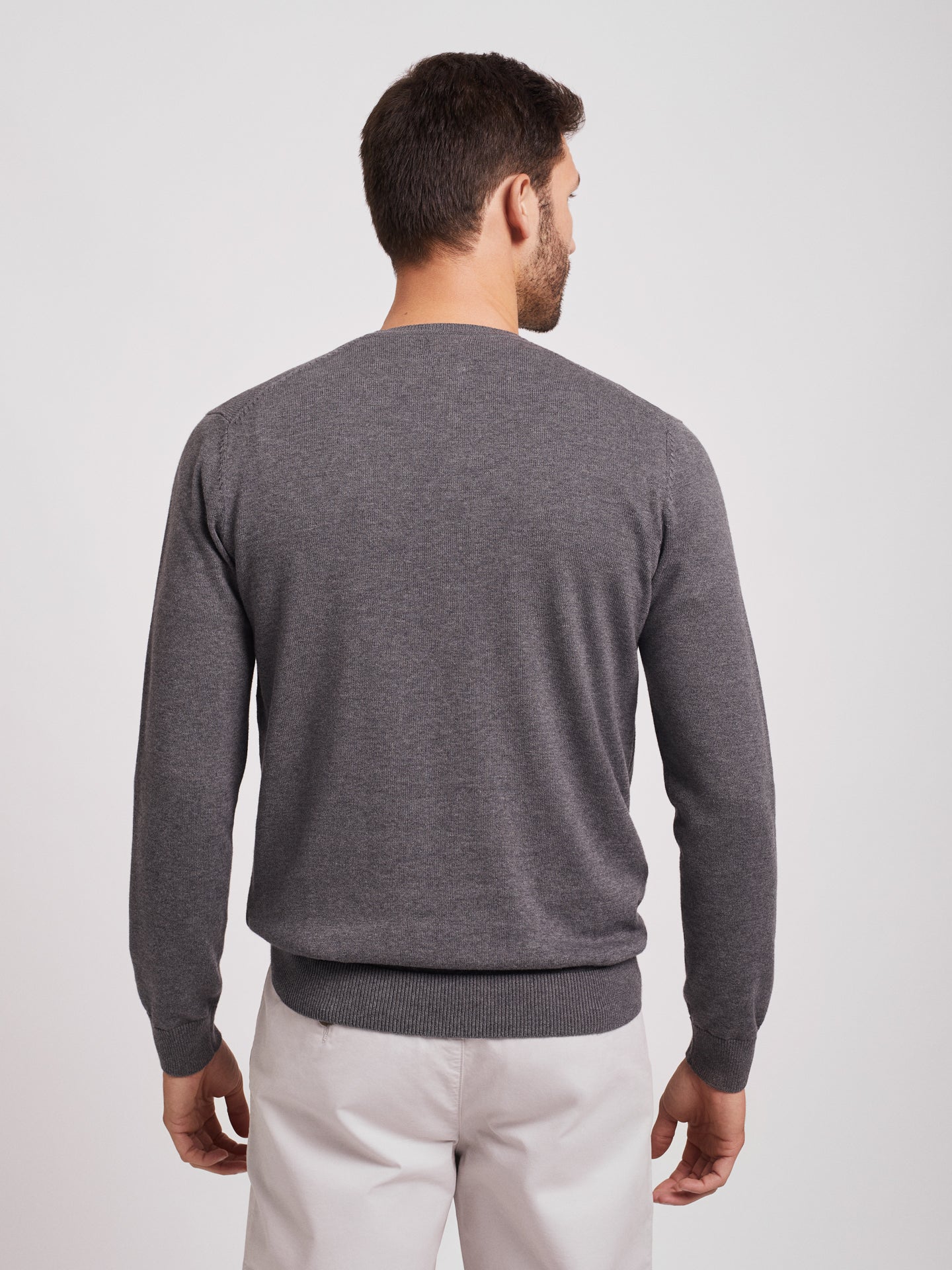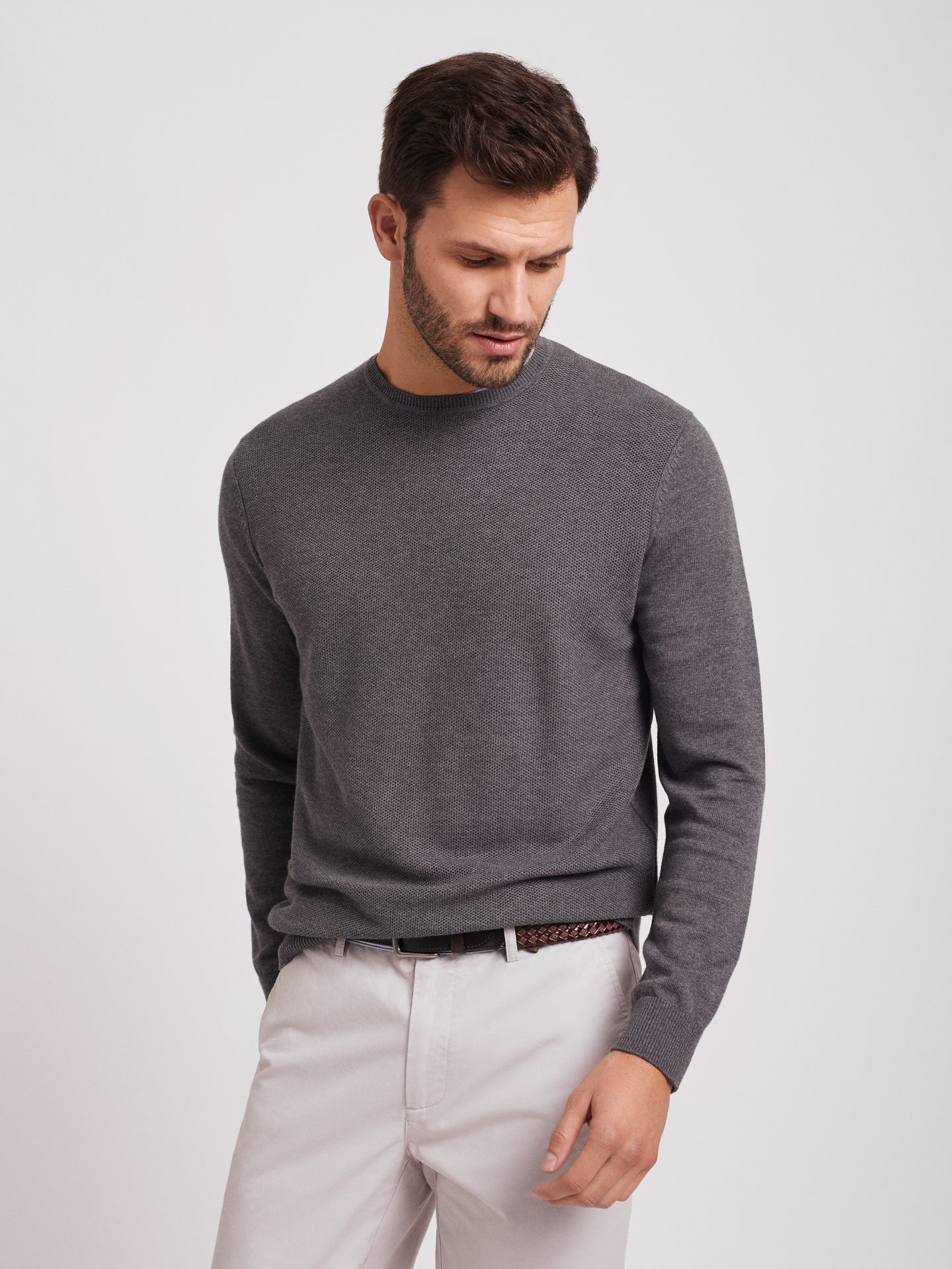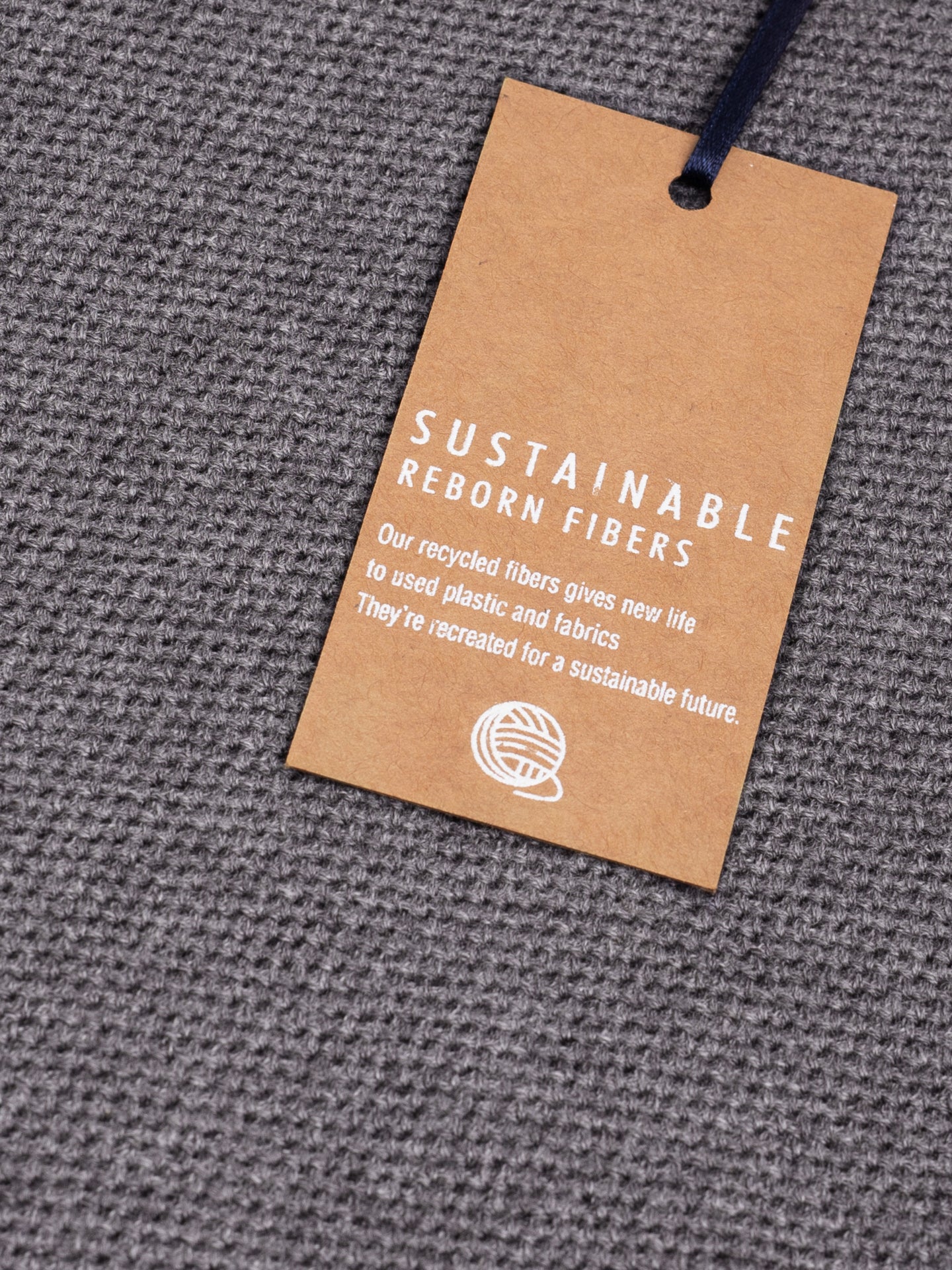 Camisola Homem Regular Fit Cinzenta decote redondo. Confeccionada em algodão orgânico e 30% de fibras recicláveis, obtidas a partir da reciclagem de plástico PET (ex: garrafas de água).