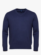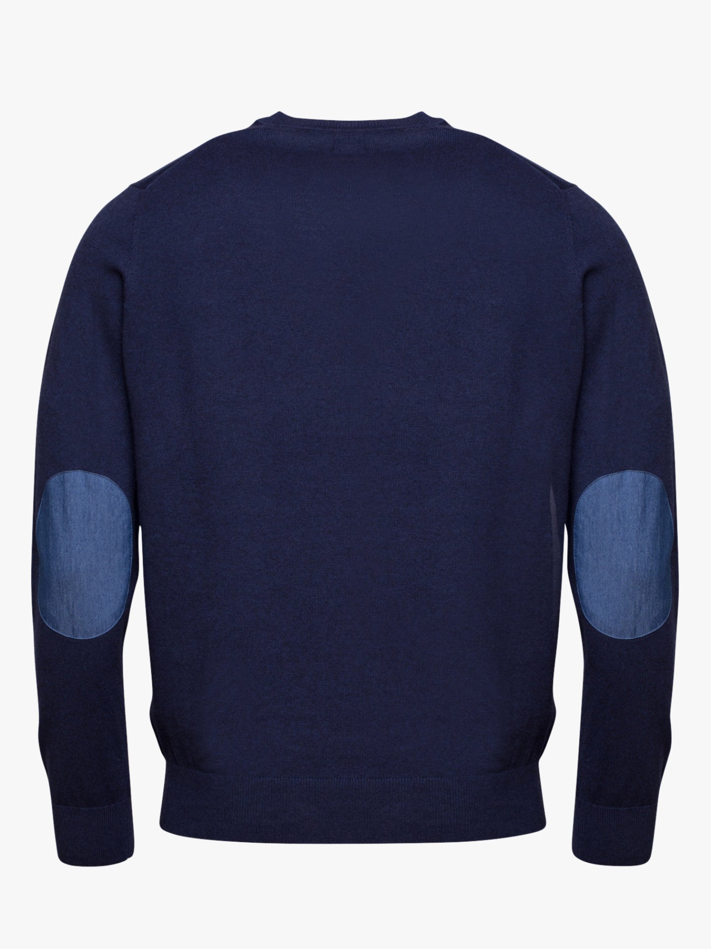 Pullover Homem algodão e caxemira decote em V azul escuro mesclado com interior colarinho e cotoveleiras em oxford azul denim. Peça indespensável no seu guarda roupa. Ideal para um fim de semana ou um dia de trabalho descontraído. Ideal para usar com uma