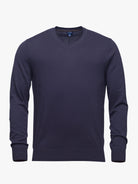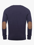 Camisola para homem azul escuro com cotoveleiras castanho. Confecionada em tecido de algodão e caxemira. Corte reto, gola em bico, manga comprida e acabamentos canelados