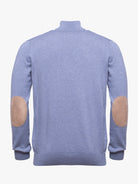 Camisola para homem gola com fecho de correr liso azul claro com cotoveleiras e detalhe carcela em beige. Confecionada em tecido de algodão e caxemira. Corte casual, manga comprida e acabamentos canelados.
