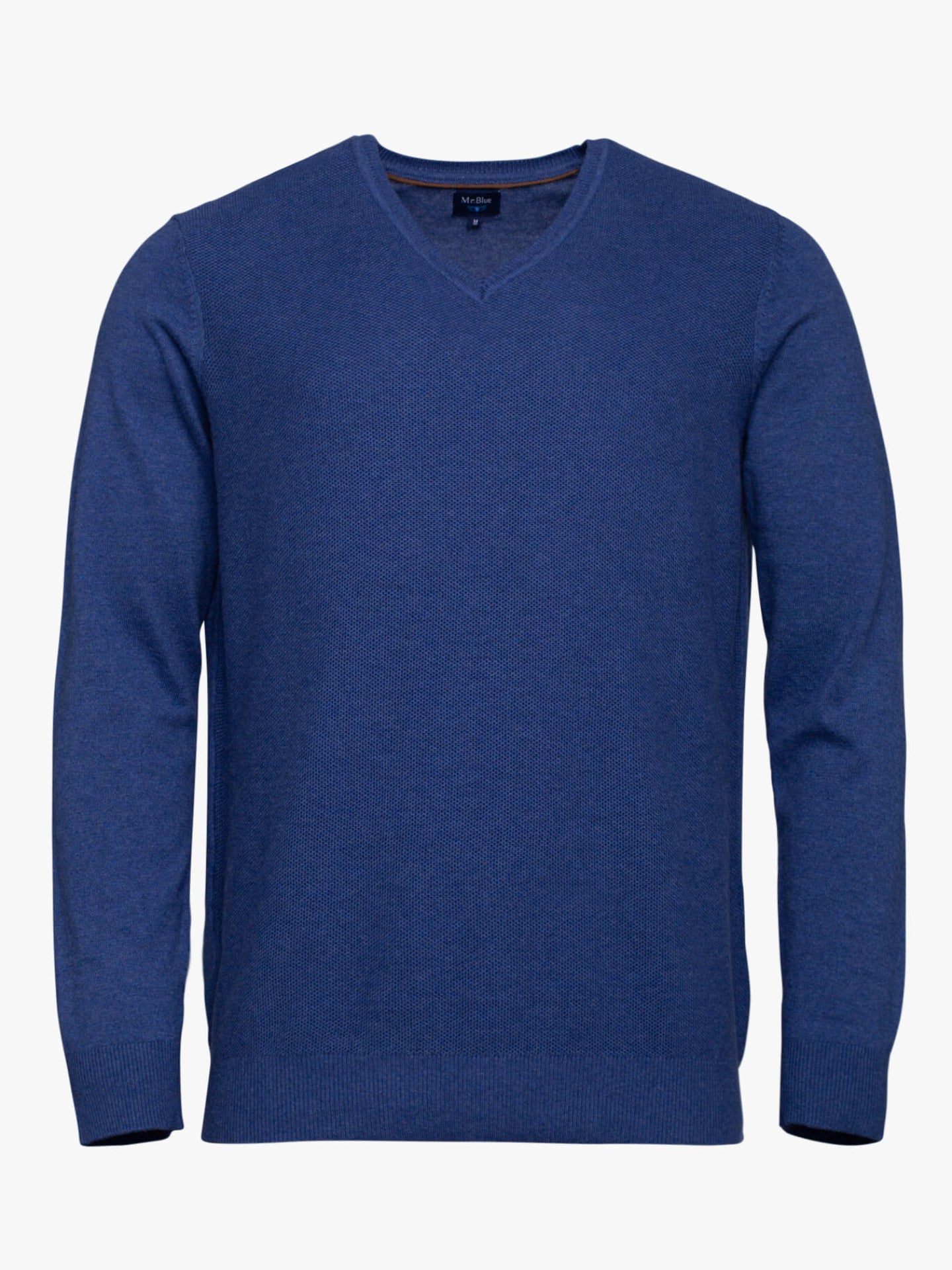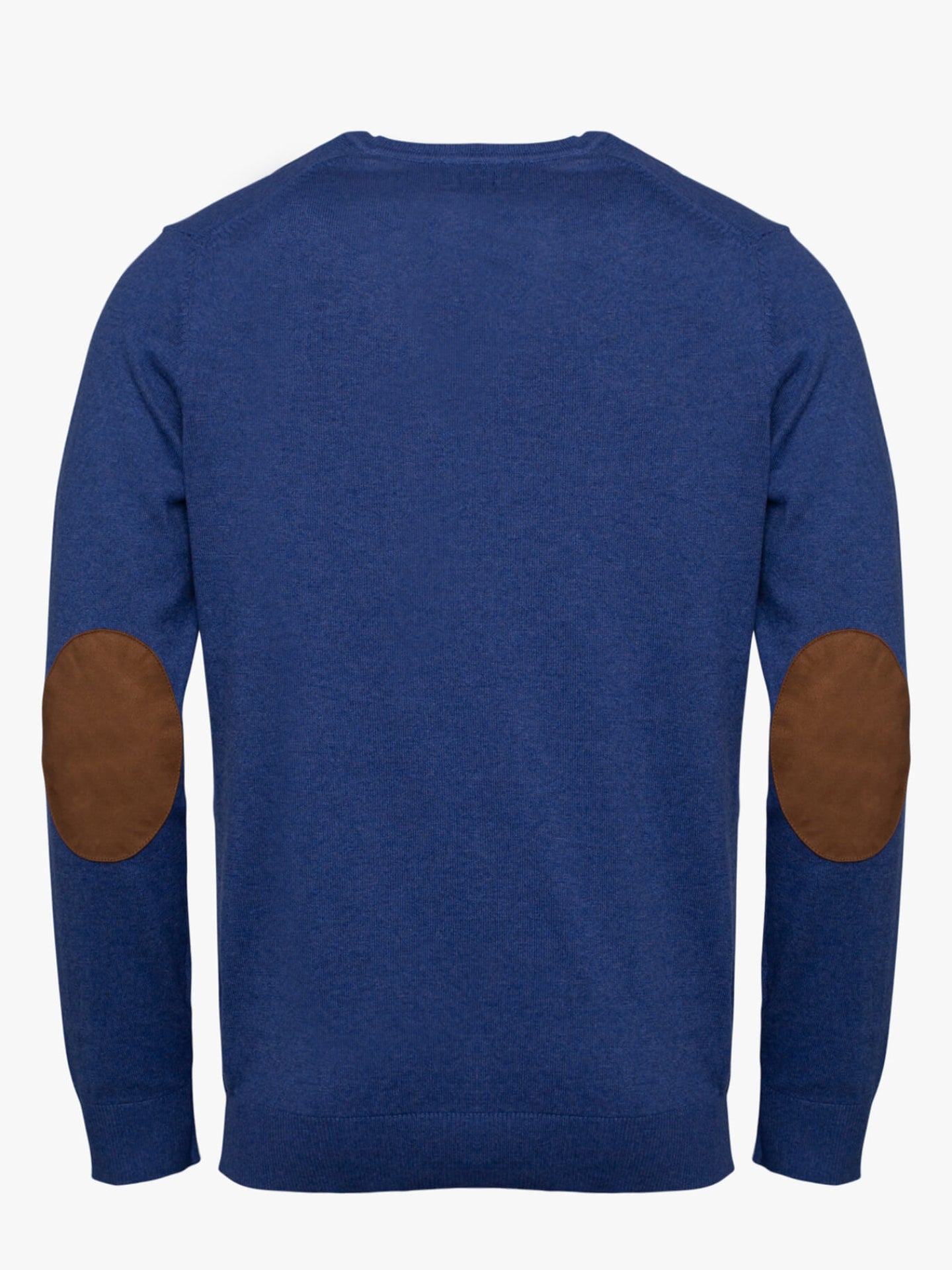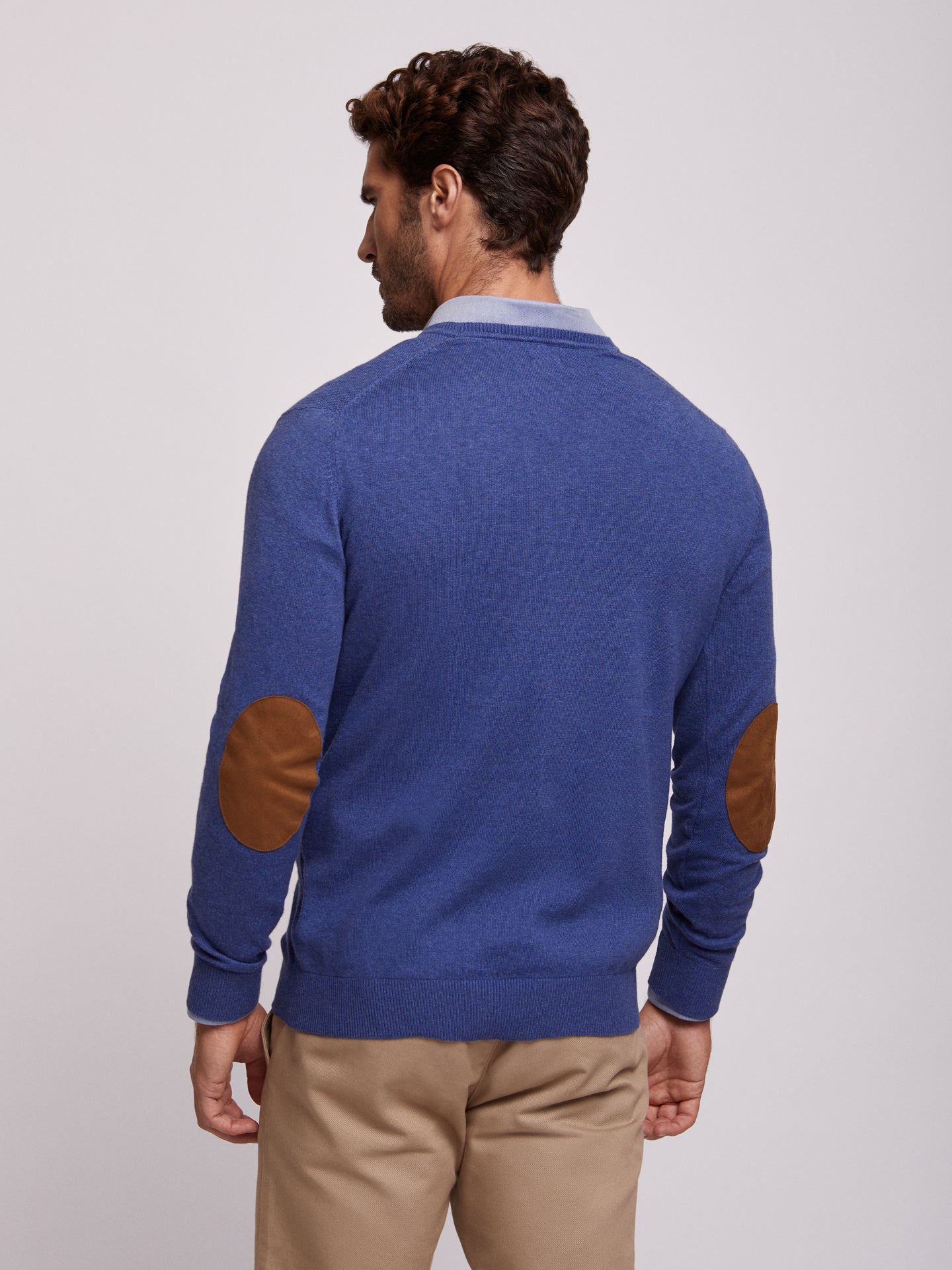 Camisola homem 100% algodão azul forte com decote em V e cotoveleiras. Peça Indispensável no seu guarda roupa. Ideal para um fim de semana ou um dia de trabalho descontraído. Ideal para usar com uma camisa.