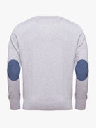 Camisola para homem cinza claro com cotoveleiras em azul forte. Confecionada em tecido de algodão e caxemira. Corte reto, gola em bico, manga comprida e acabamentos canelados