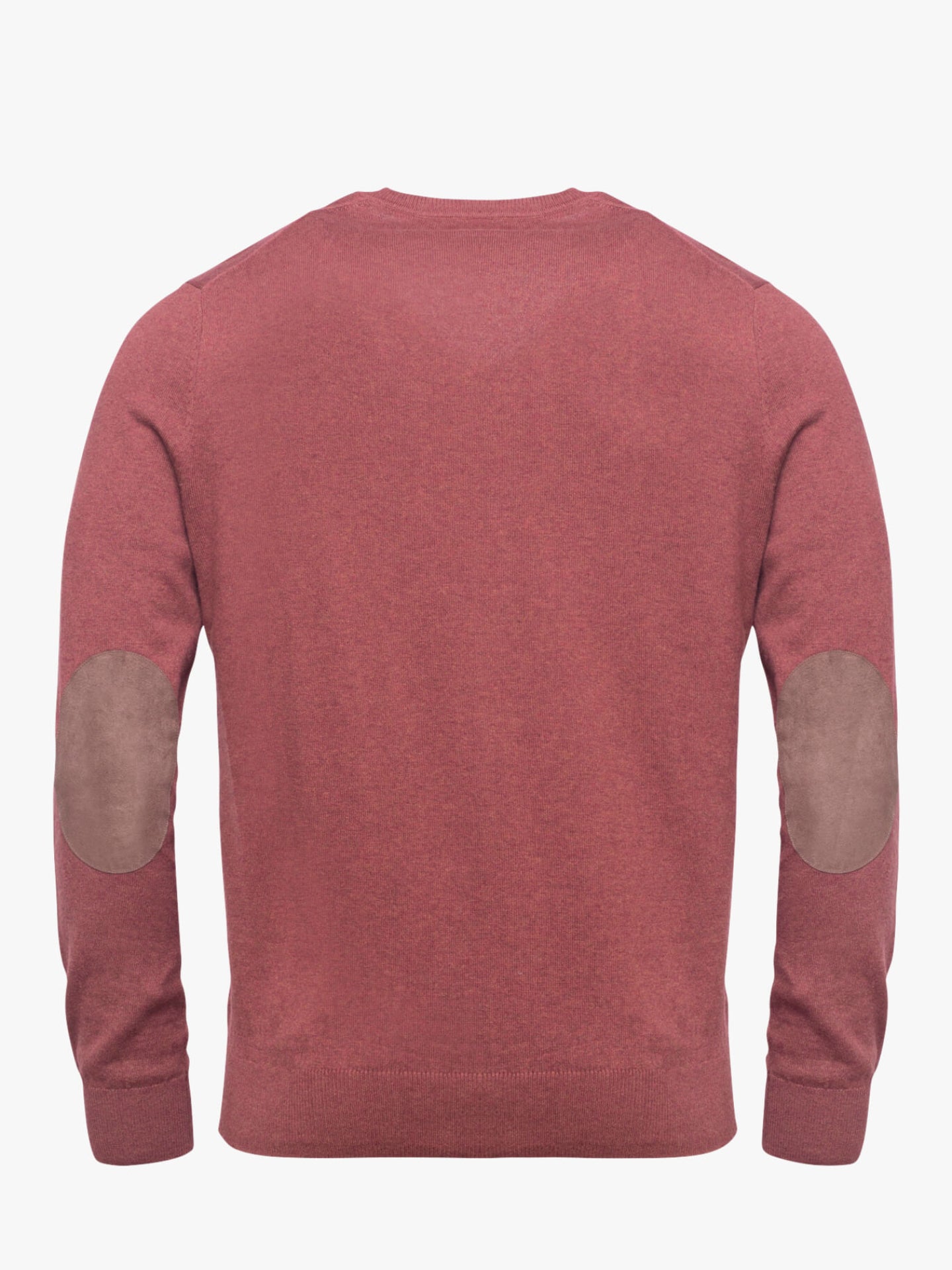 Camisola para homem laranja tijolo com cotoveleiras em castanho. Confecionada em tecido de algodão e caxemira. Corte reto, gola em bico, manga comprida e acabamentos canelados