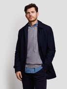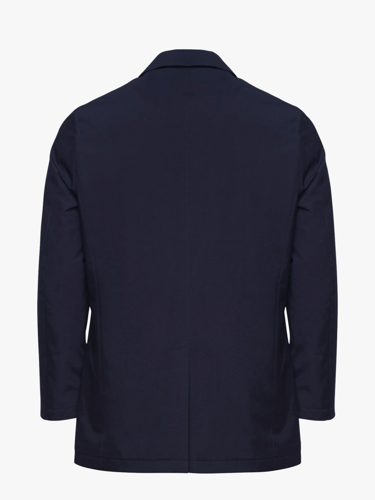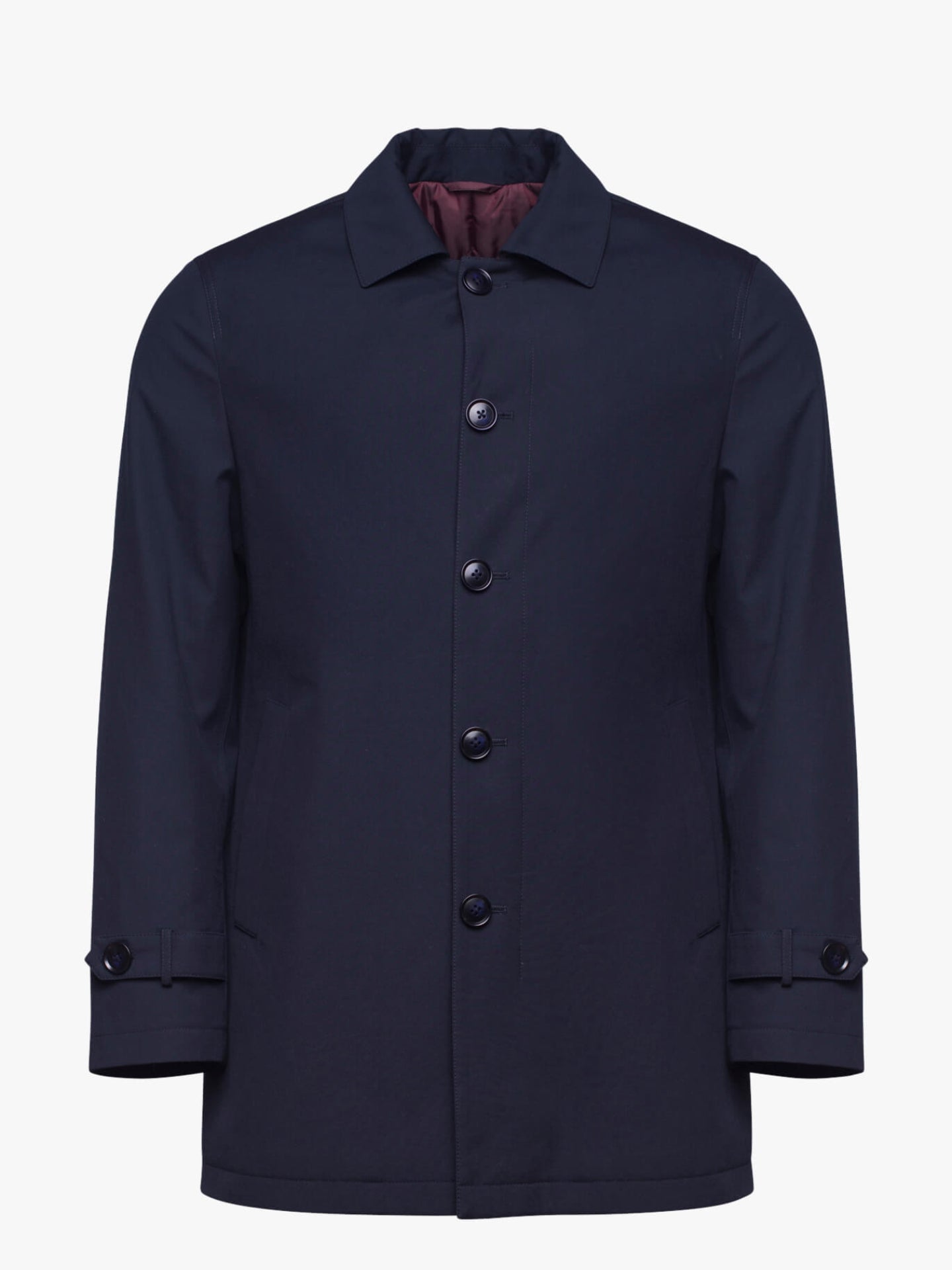 Gabardine comprida acolchoada para homem em azul escuro. Corte direito e fecho de botões. Quente e muito confortável, a escolha certa para os dias de Inverno.