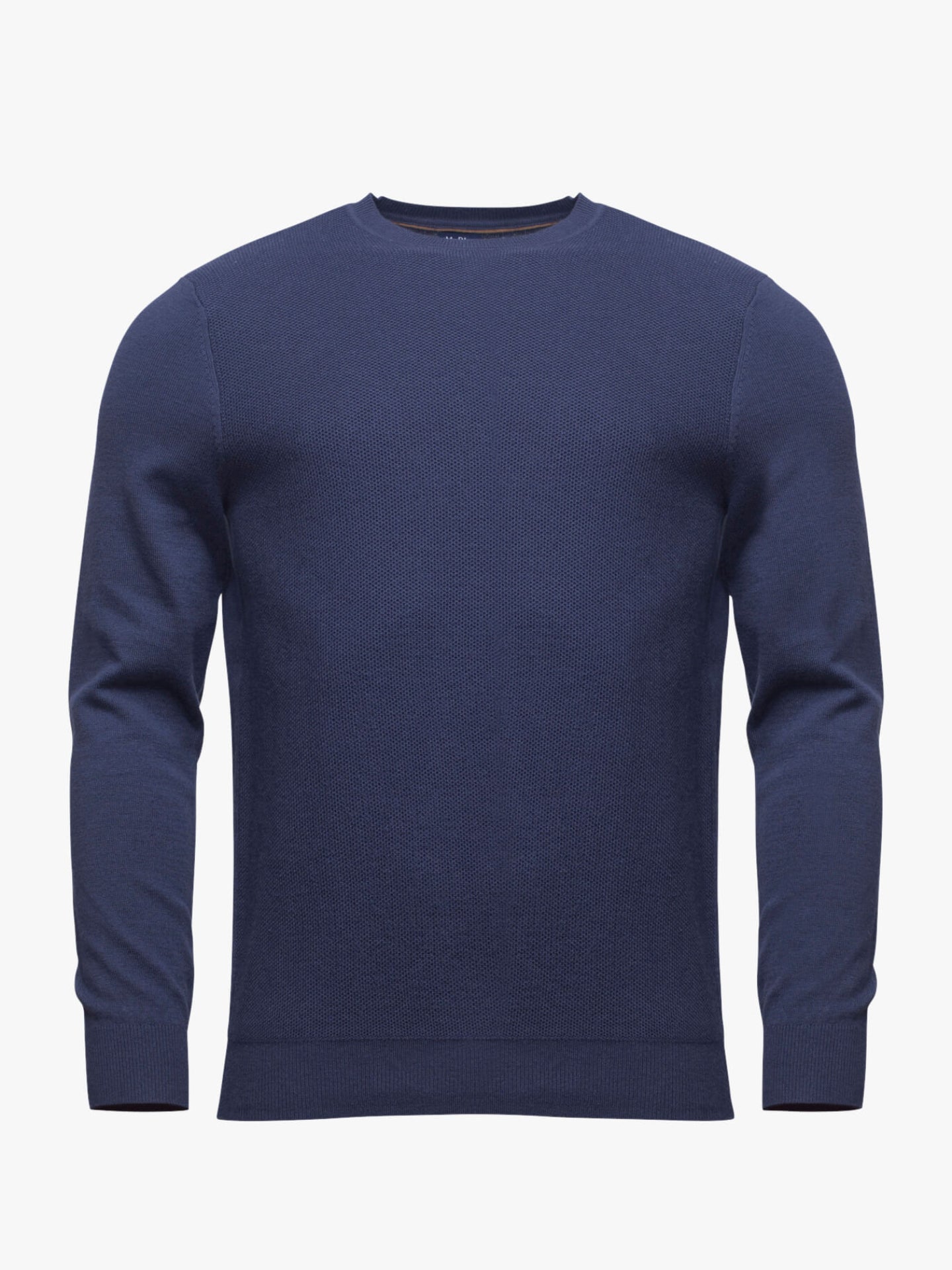 Camisola para homem gola redonda azul escuro com cotoveleiras em castanho. Confecionada em tecido de algodão e lã Merino. Corte casual, gola redonda, manga comprida e acabamentos canelados.