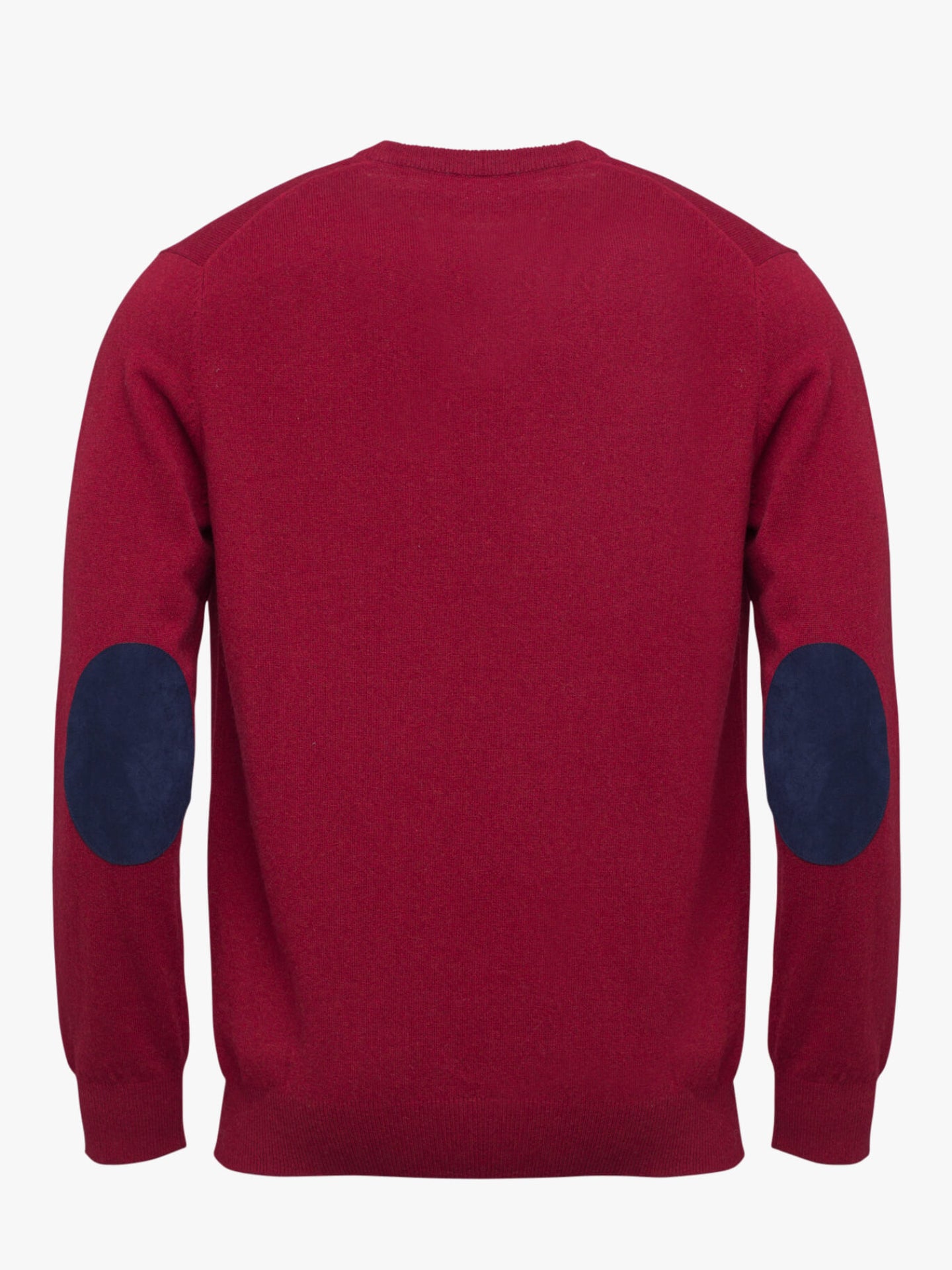 Camisola para homem vermelho escuro com cotoveleiras em azul escuro. Confecionada em lã. Corte reto, gola em bico, manga comprida e acabamentos canelados