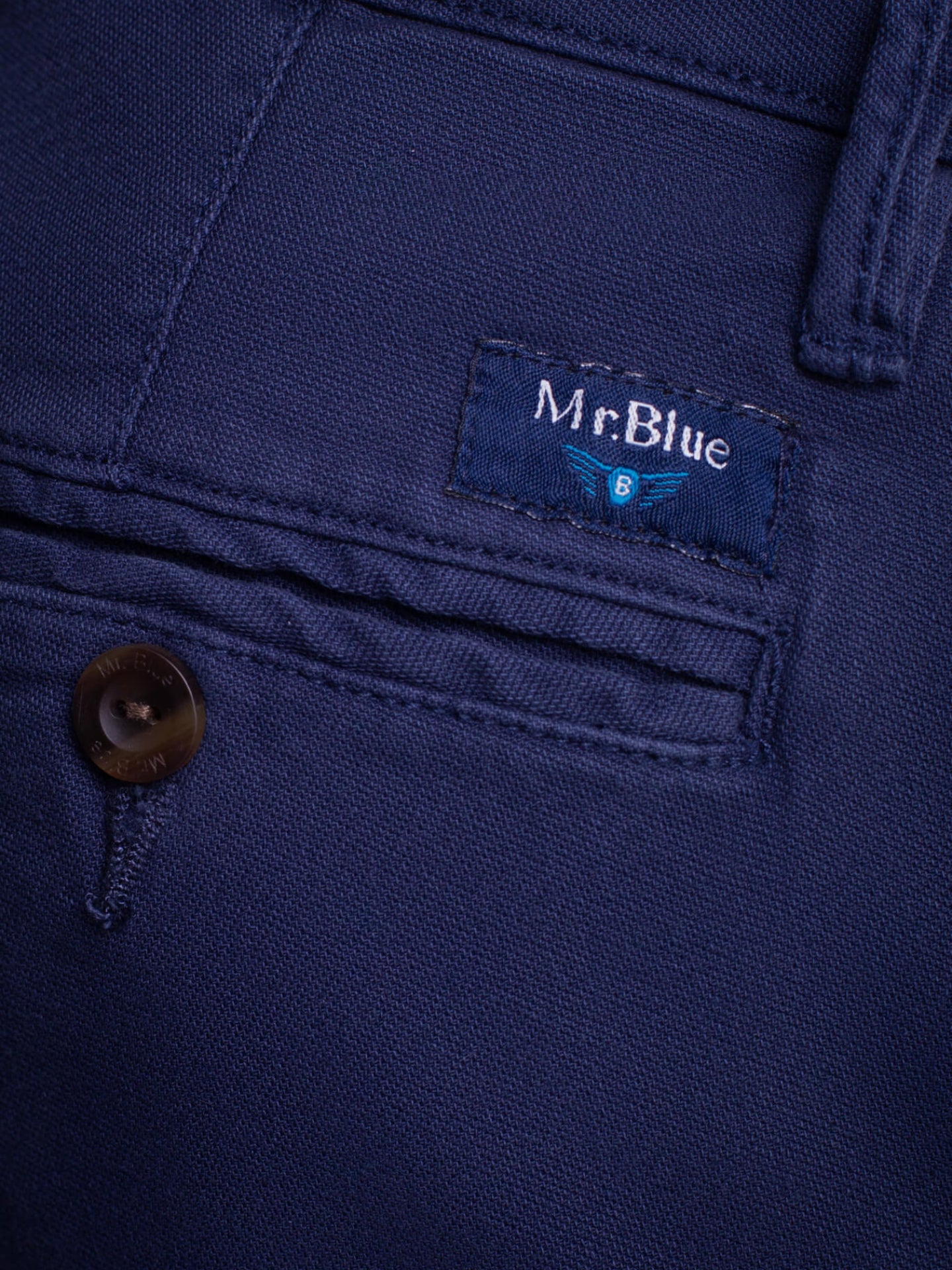 Calças chino para homem azul intermédio confecionadas em tecido algodão. Corte slim, fecho de botão e fecho de correr oculto por carcela, dois bolsos laterais, dois bolsos com casa de botão abotoados atrás e presilhas para cinto. Interior cós com padrão.