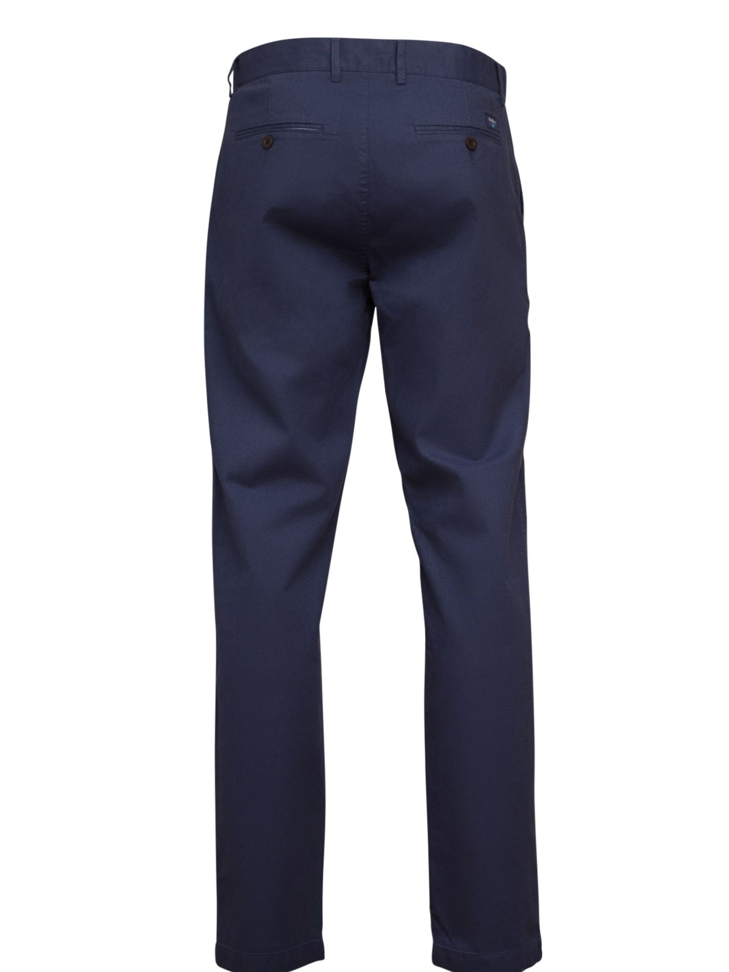 Calças Chino com estrutura lisas. Carcela com fecho de correr oculto, 2 bolsos laterais, 2 bolsos de ilhós abotoado na parte posterior e presilhas para o cinto. Muito confortável e versátil. É a escolha ideal para um dia de trabalho ou para o fim de sema