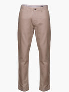 Calças Chinos Homem 100% Algodão Oxford beje. Bolsos traseiros em twill bordeaux e azul marinho. Interior cós mil raias e riscas castanho e branco. Corte Tailored Fit. Muito confortáveis, são a escolha certa para os dias mais quentes