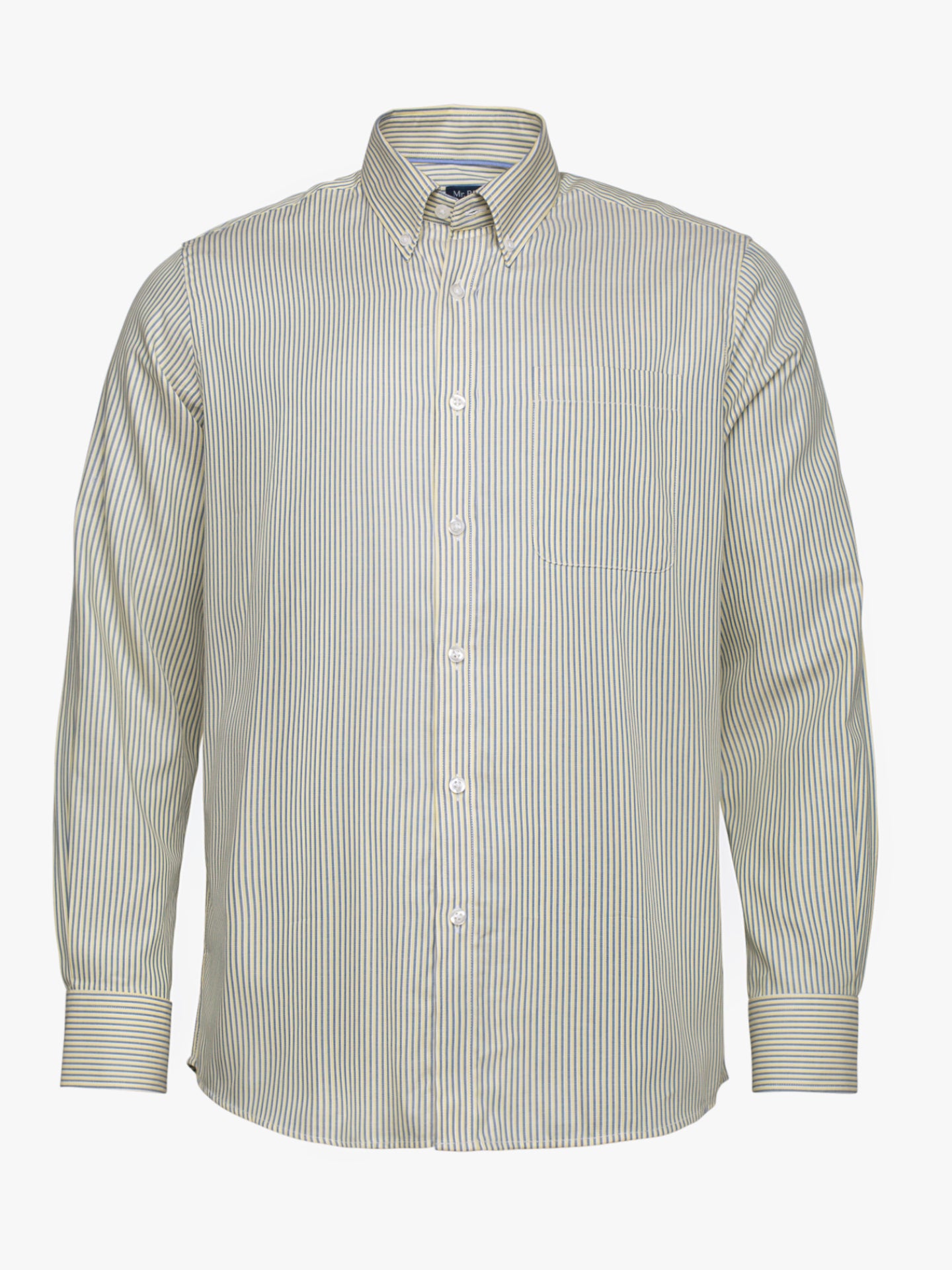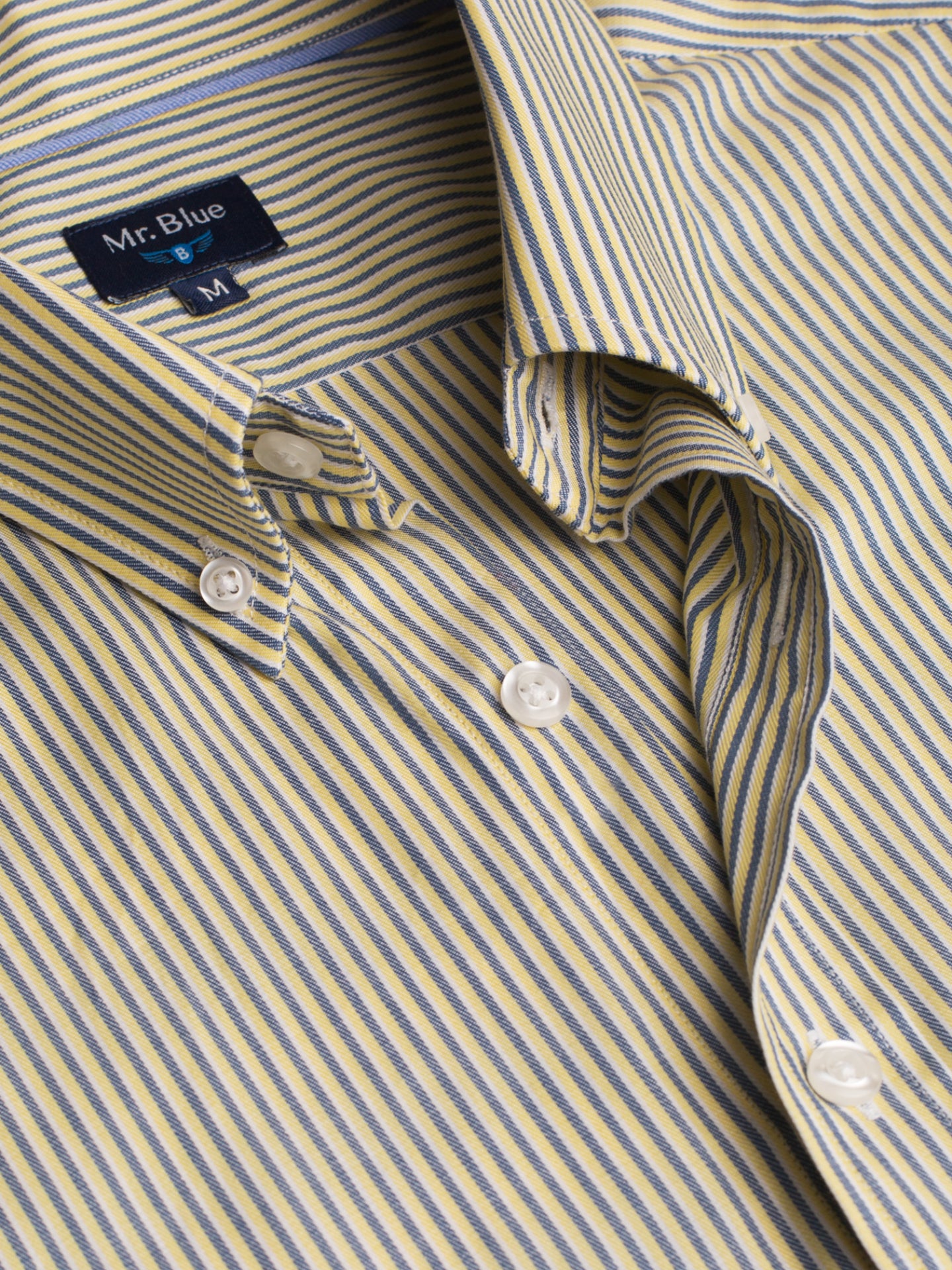 Camisa de homem 100% algodão às riscas finas azul claro e amarelo com bolso. Corte regular, colarinho com botões, fecho mediante abotoadura frontal e manga comprida com acabamento em punho abotoado.